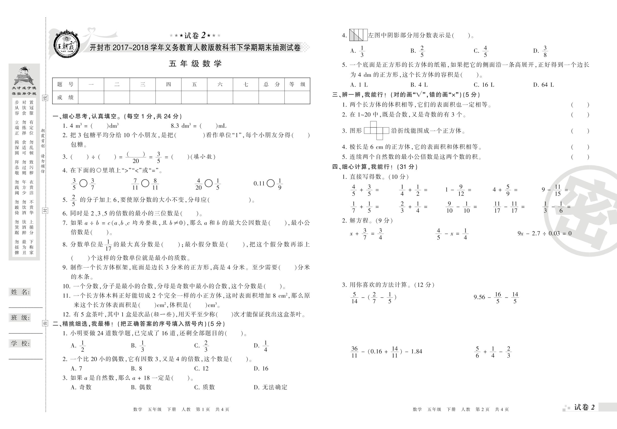 2017-2018学年第二学期开封市五年级数学试卷(人教版)【2】