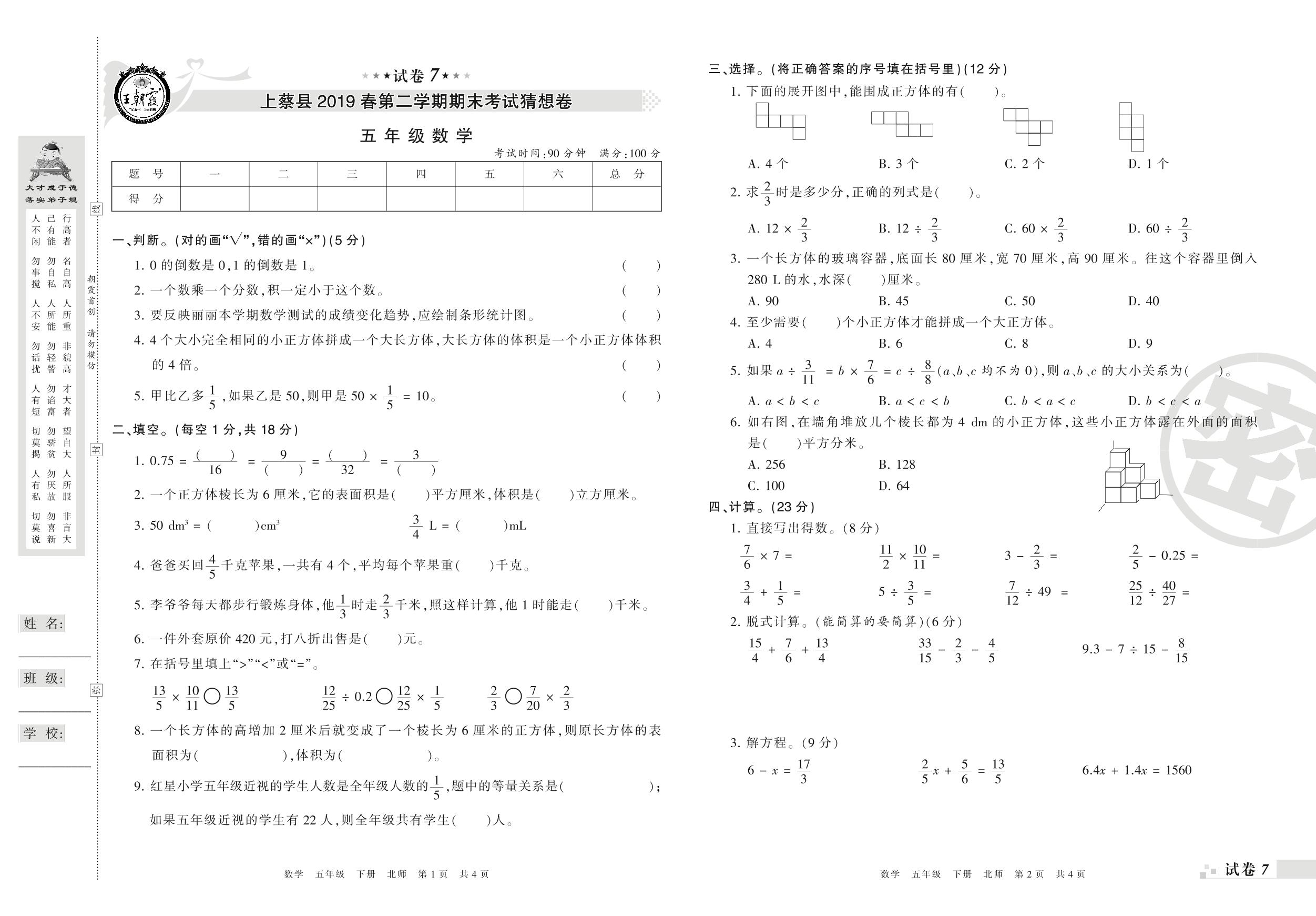 2018-2019学年第二学期驻马店市上蔡县猜想卷五年级数学试卷(北师版)【7】