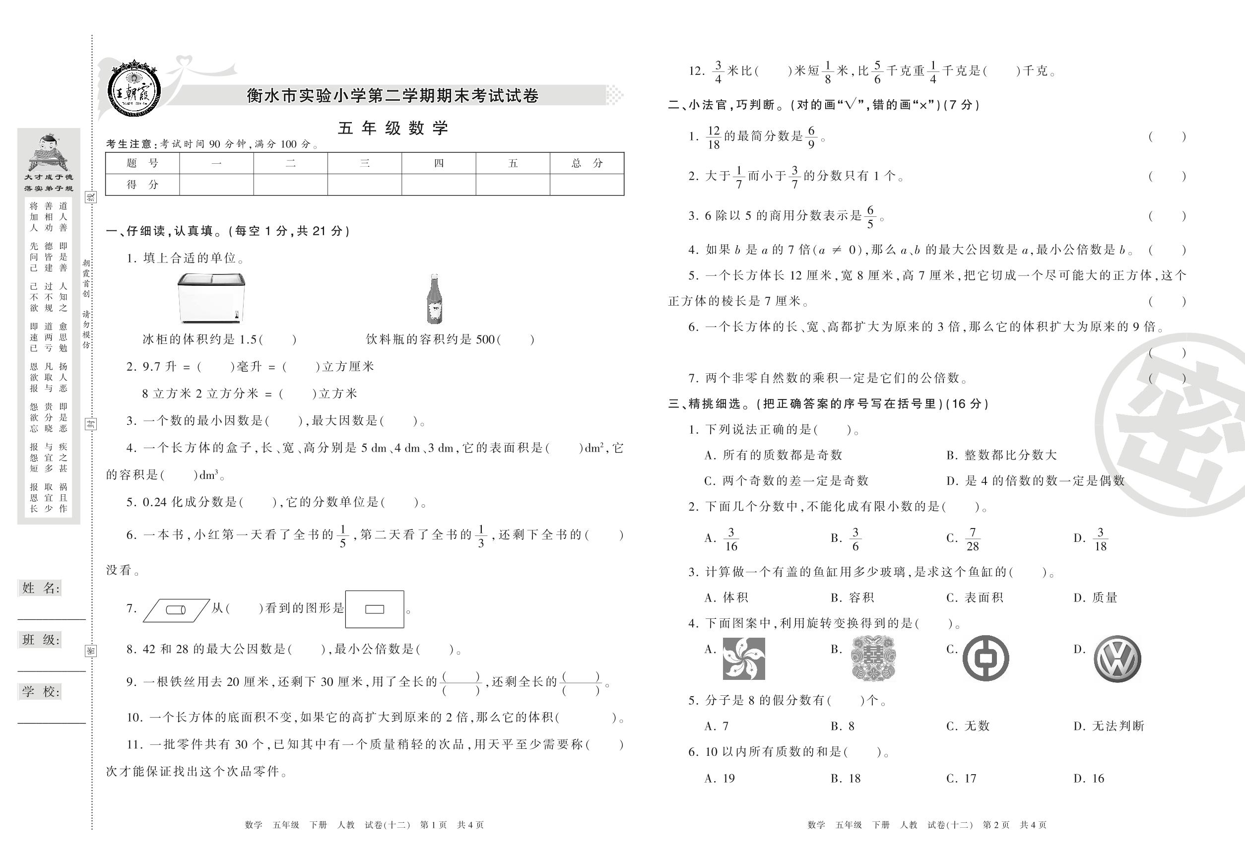 2015-2016学年第二学期衡水市实验小学五年级数学试卷(人教版)【12】