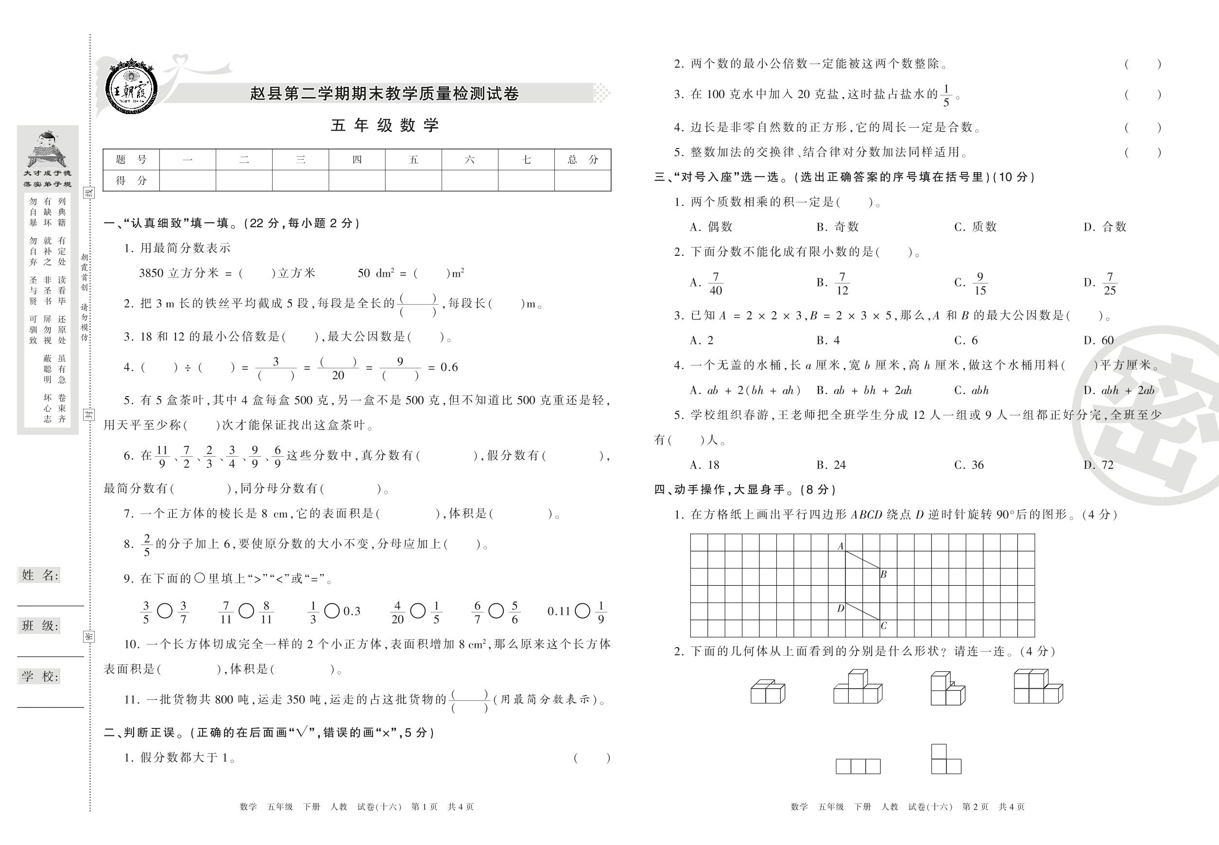 2015-2016学年第二学期石家庄市赵县五年级数学试卷(人教版)【16】