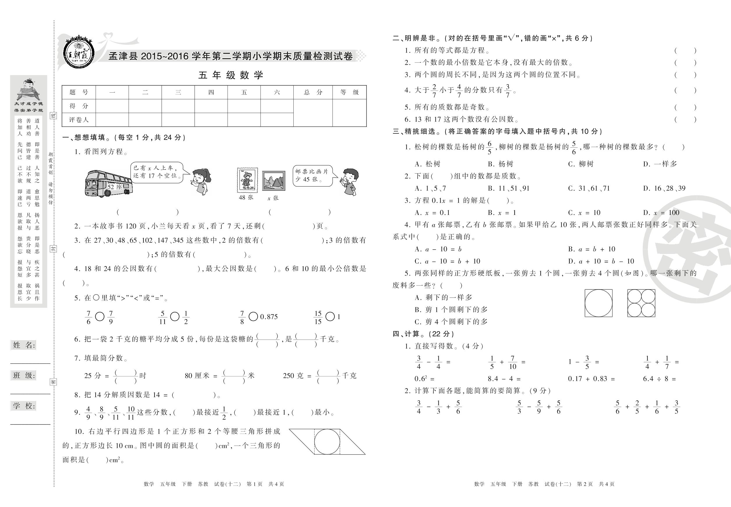 2015-2016学年第二学期洛阳市孟津县五年级数学试卷(苏教版)【12】