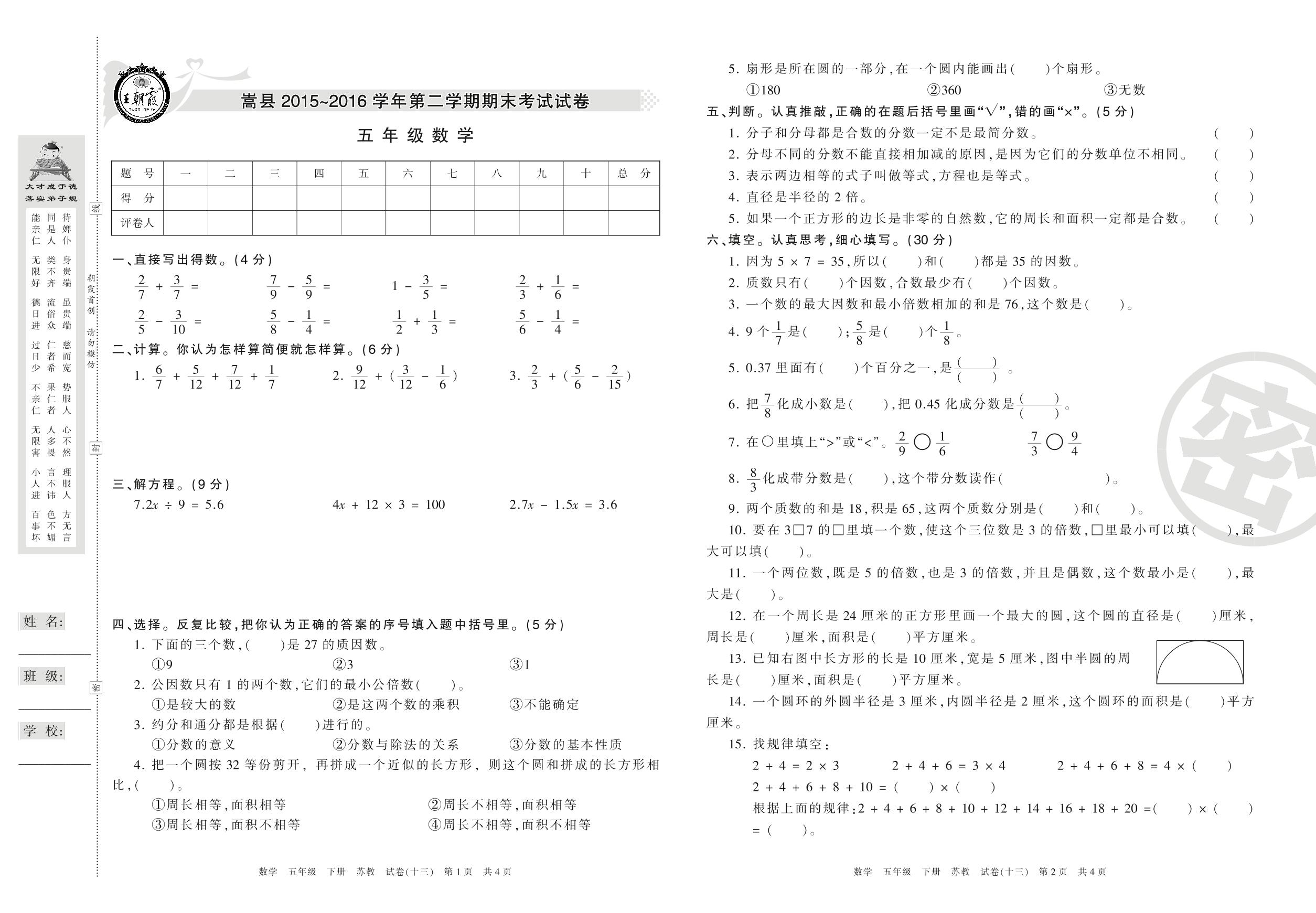 2015-2016学年第二学期洛阳市嵩县五年级数学试卷(苏教版)【13】