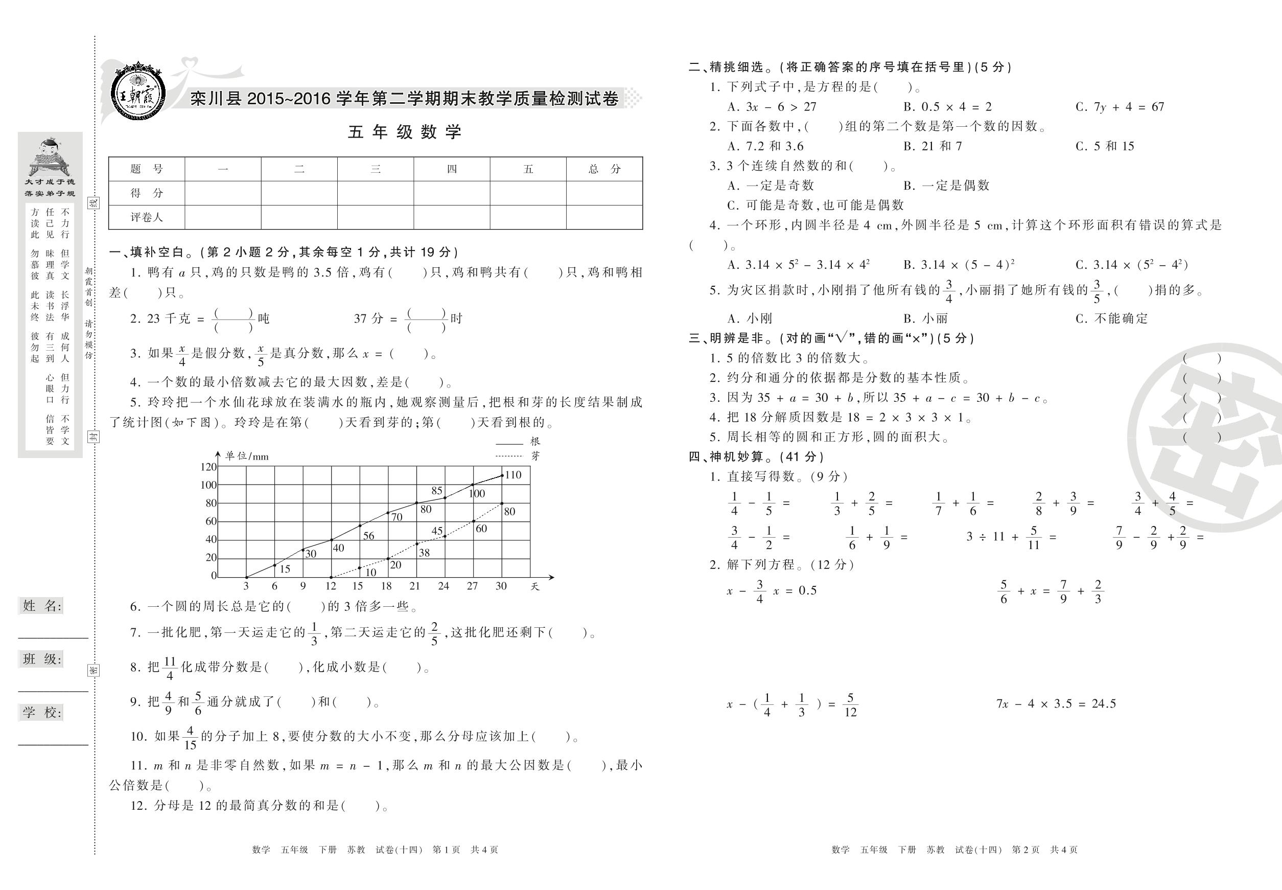2015-2016学年第二学期洛阳市栾川县五年级数学试卷(苏教版)【14】