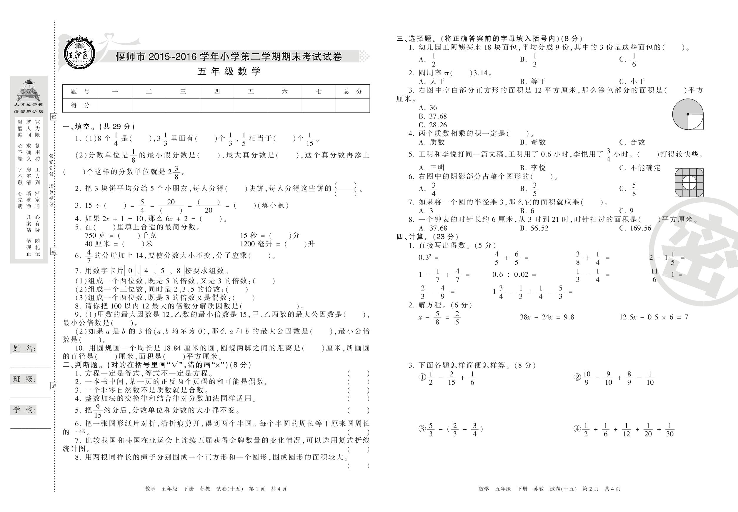 2015-2016学年第二学期偃师市五年级数学试卷(苏教版)【15】