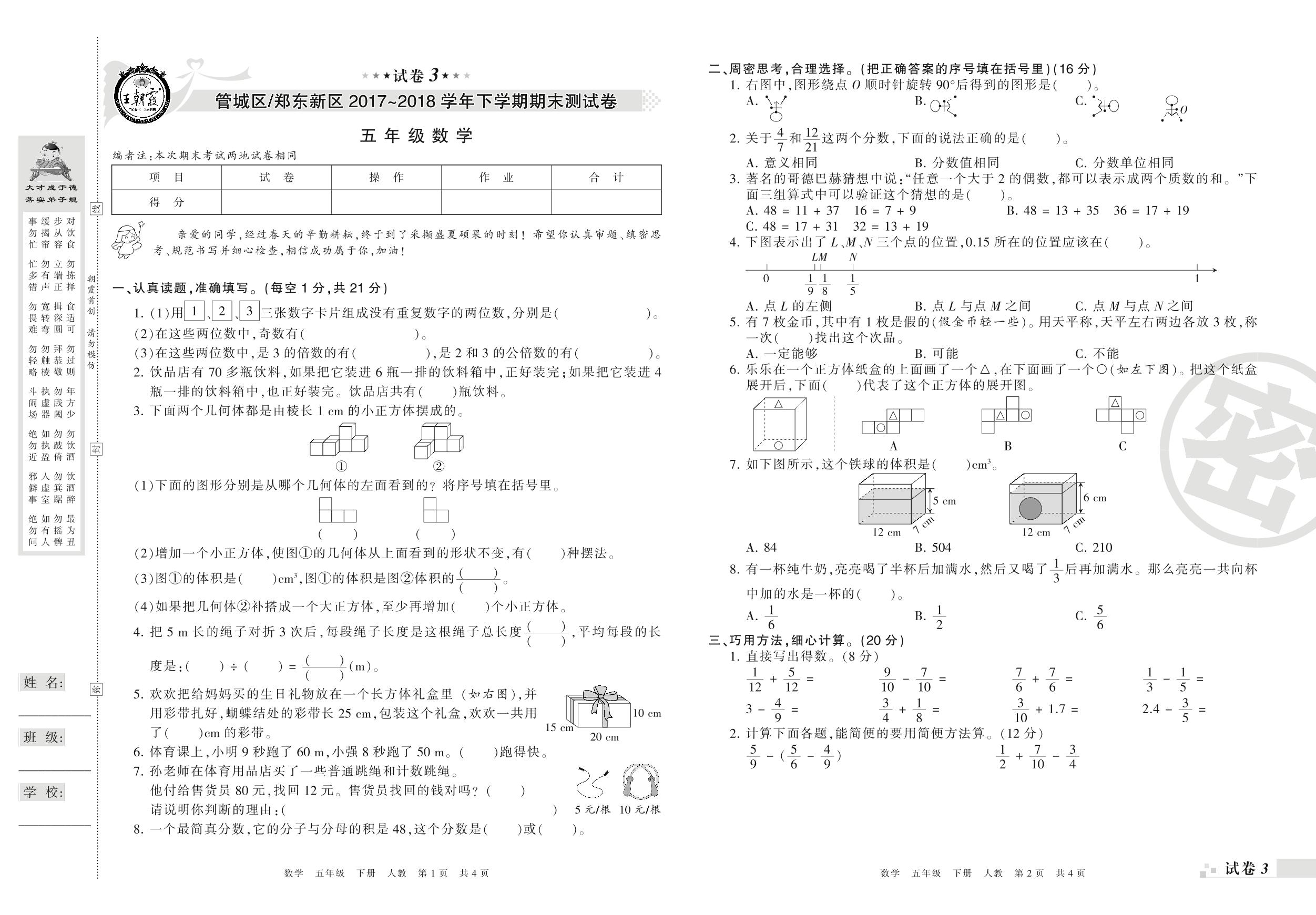 2017-2018学年第二学期郑州市管城区、郑东新区五年级数学试卷(人教版)【3】