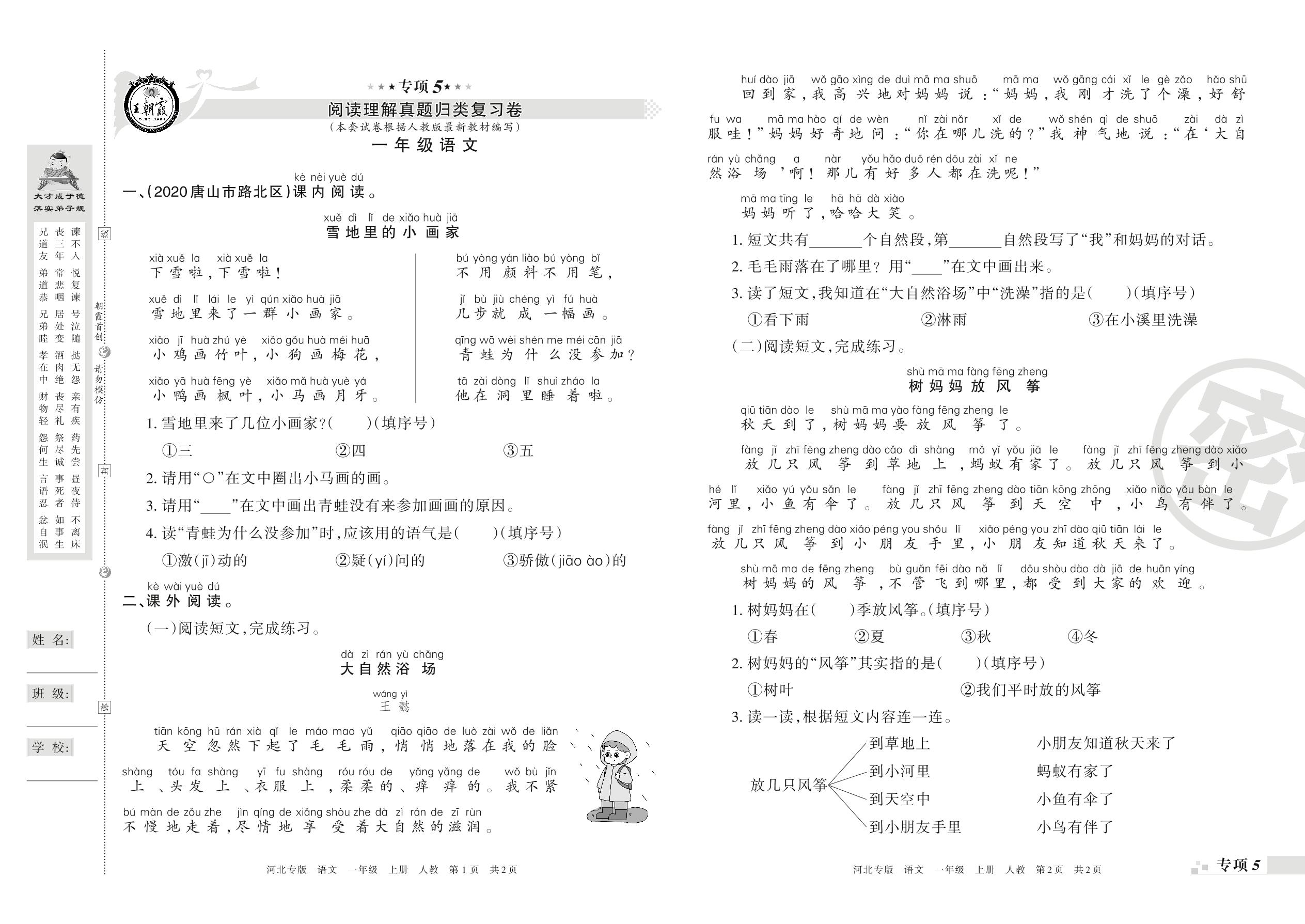 王朝霞期末专项卷——阅读理解、写话真题归类复习一年级上册语文(人教版)_R211019160814893【0】