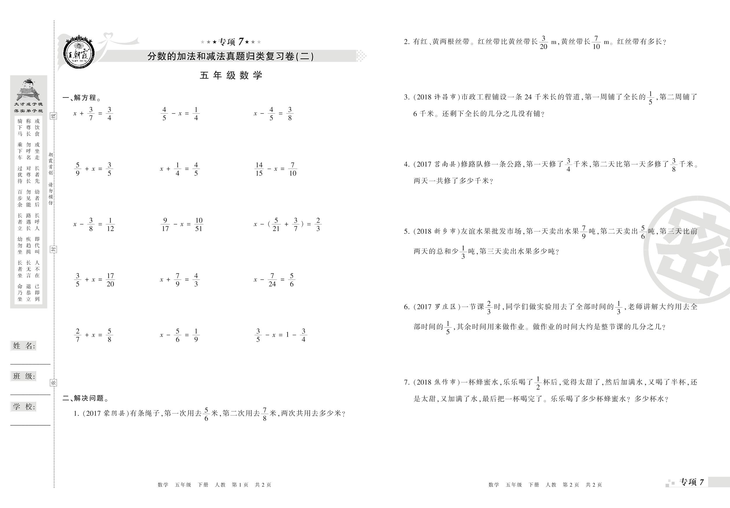 王朝霞期末专项卷——分数的加法和减法(二) 图形的运动、折线统计图及数学广角:找次品真题归类复习卷五年级下册数学(人教版)_R210804174844【0】