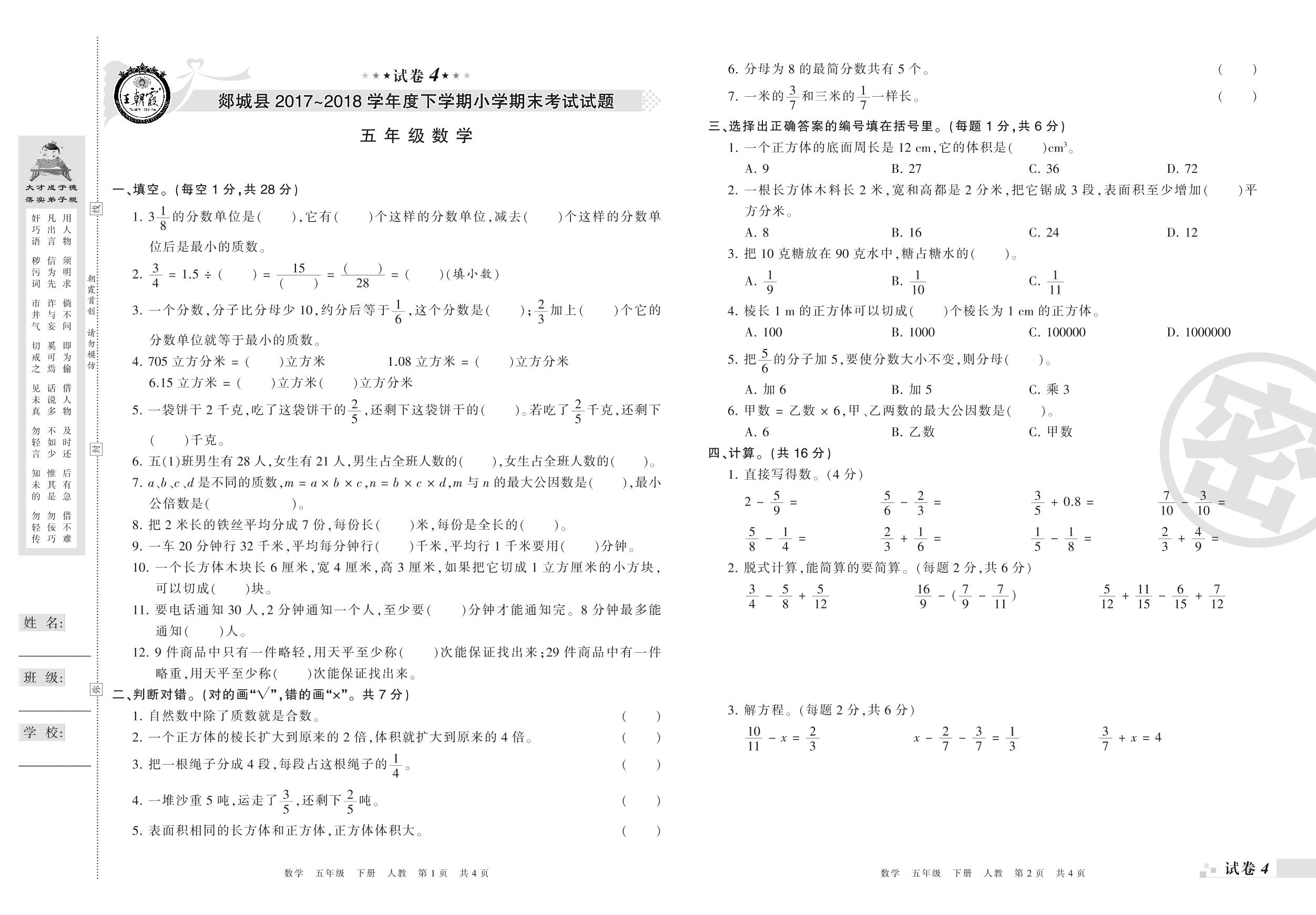 2017-2018学年第二学期临沂市郯城县五年级数学试卷(人教版)【4】