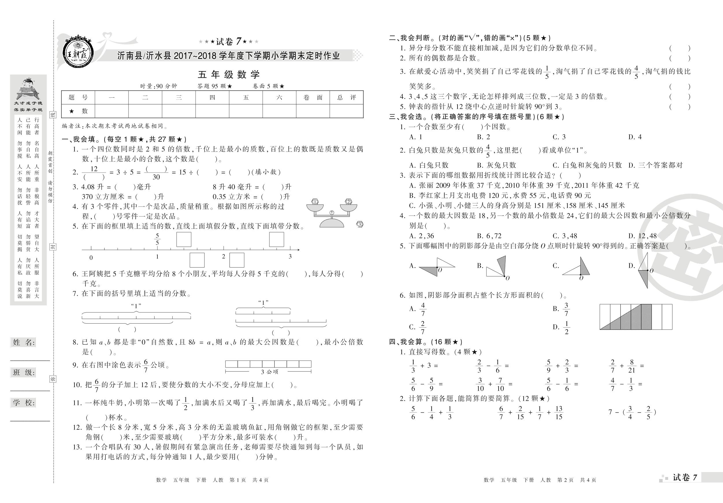 2017-2018学年第二学期临沂市沂南县、沂水县五年级数学试卷(人教版)【7】