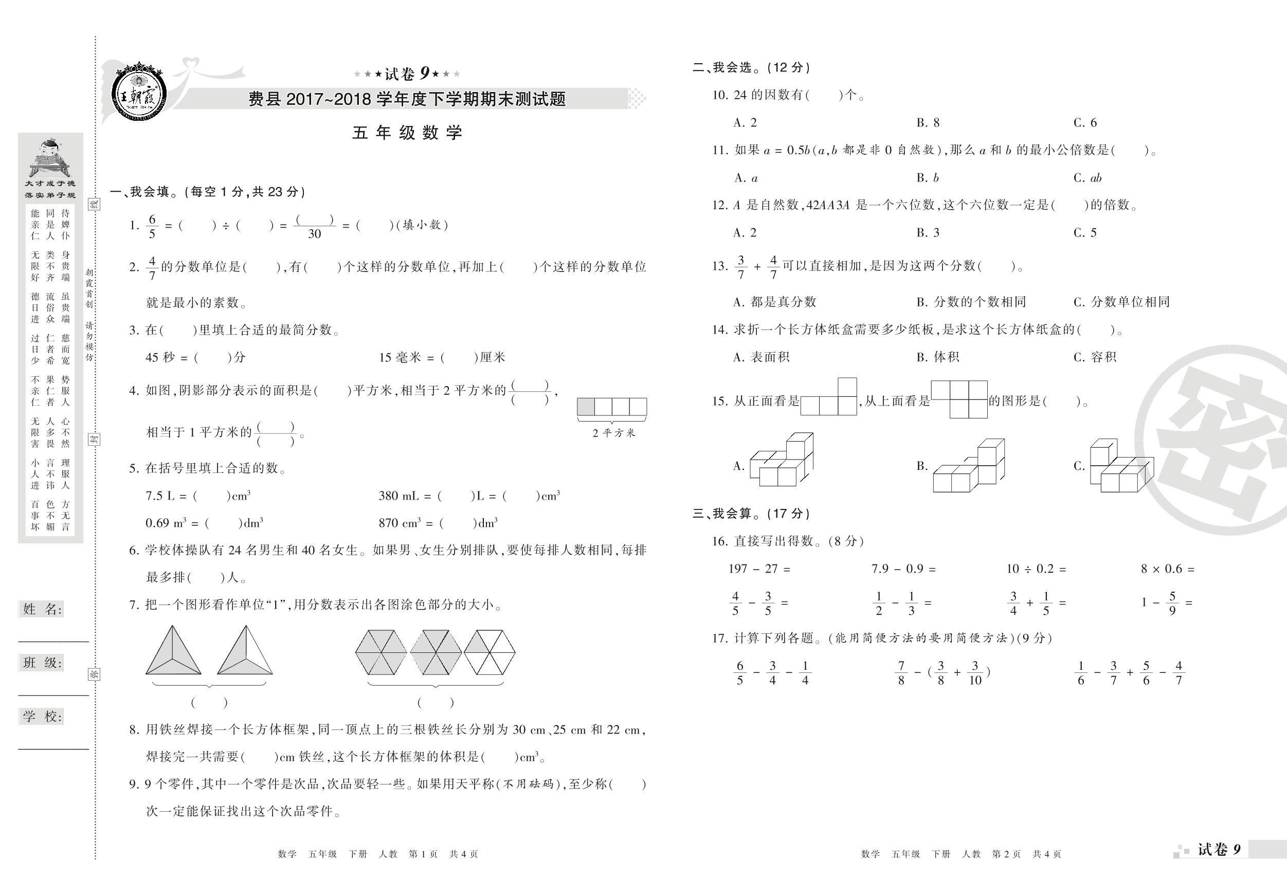 2017-2018学年第二学期临沂市费县五年级数学试卷(人教版)【9】