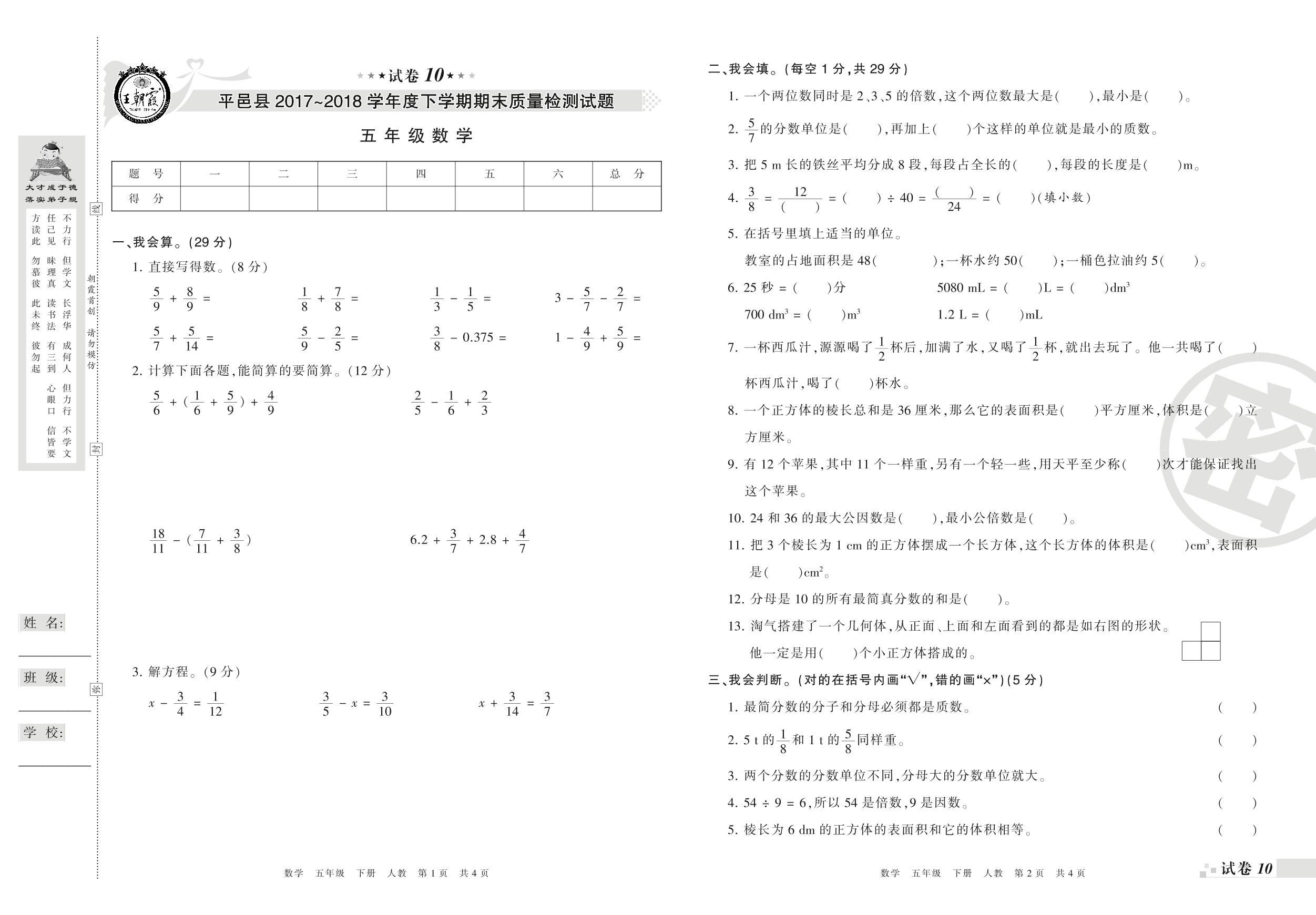 2017-2018学年第二学期临沂市平邑县五年级数学试卷(人教版)【10】