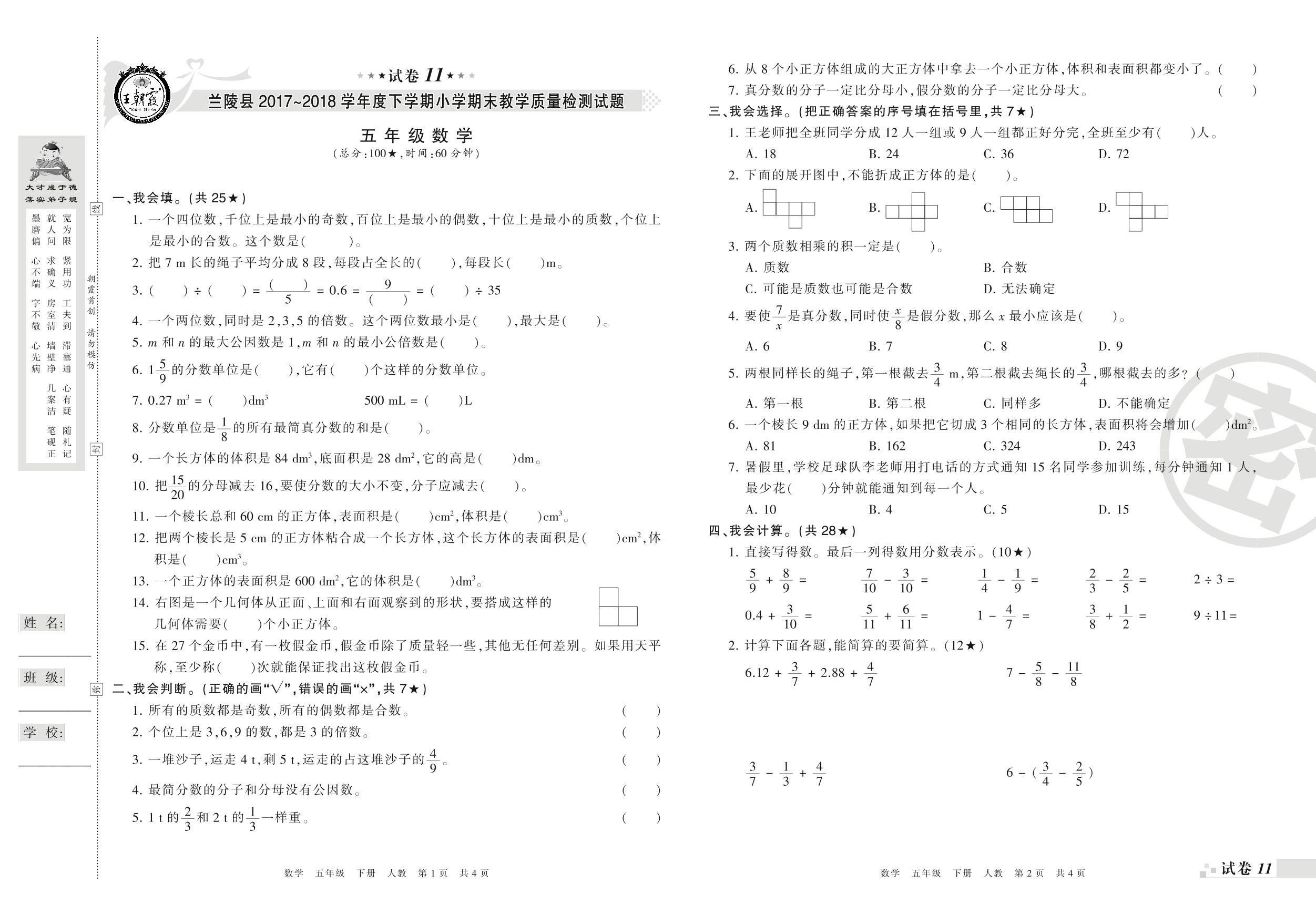2017-2018学年第二学期临沂市兰陵县五年级数学试卷(人教版)【11】