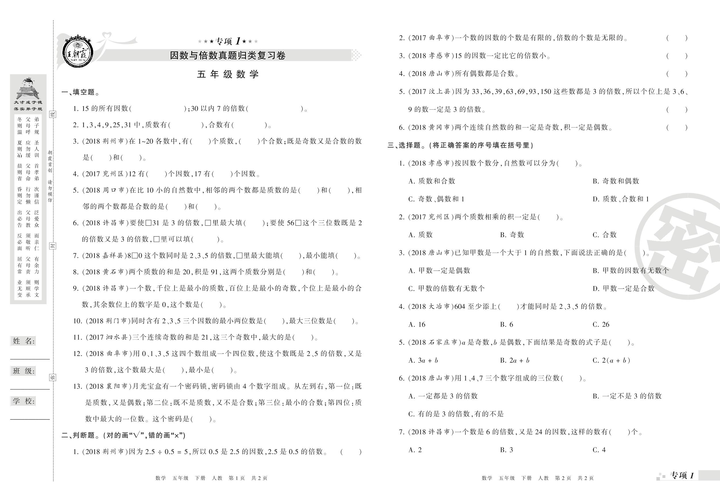 王朝霞期末专项卷——因数与倍数、长方体和正方体(一)真题归类复习卷五年级下册数学(人教版)_R210804174954【0】