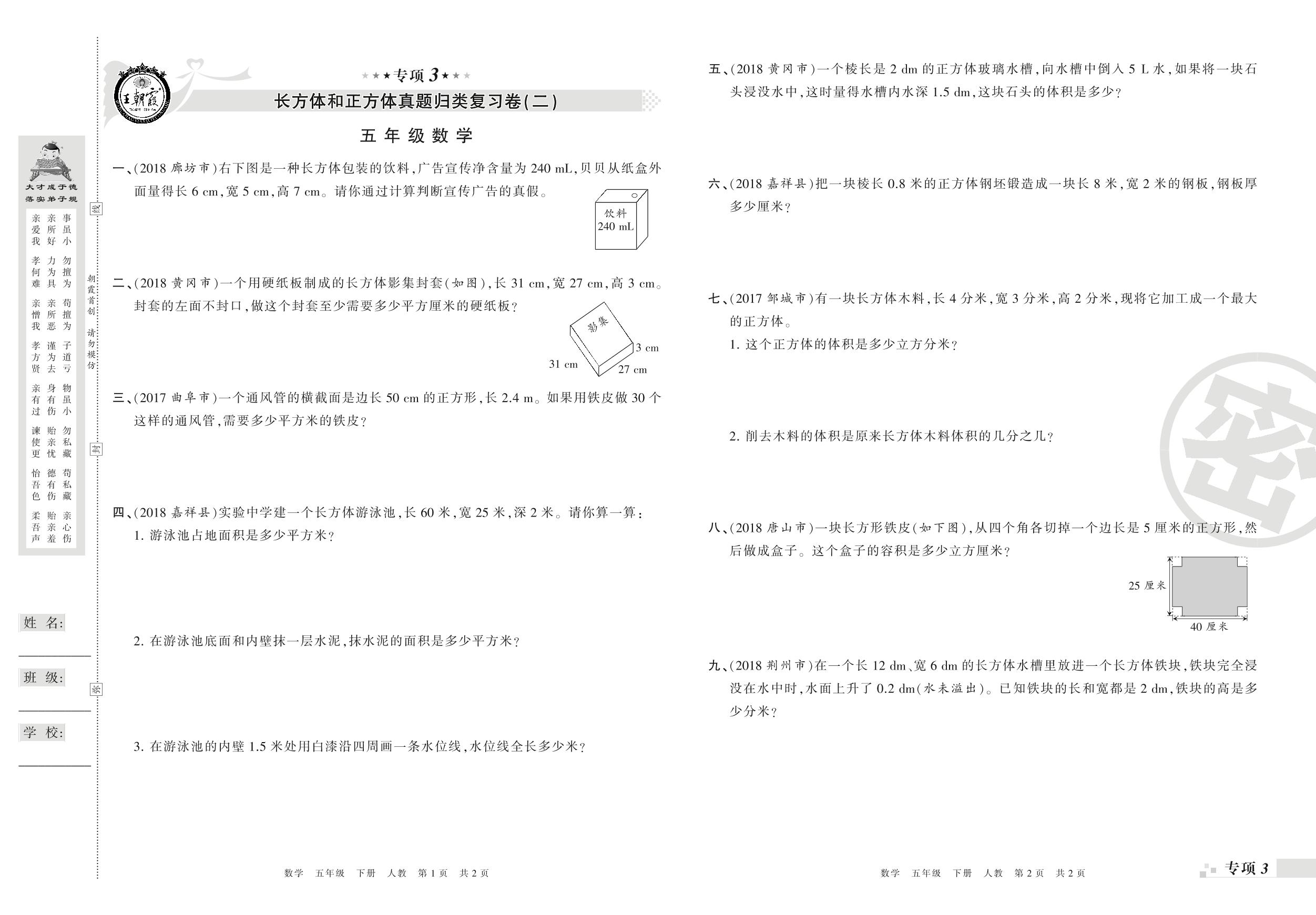 王朝霞期末专项卷——长方体和正方体(二)、分数的意义和性质(一)真题归类复习卷五年级下册数学(人教版)_R210804174955001【0】