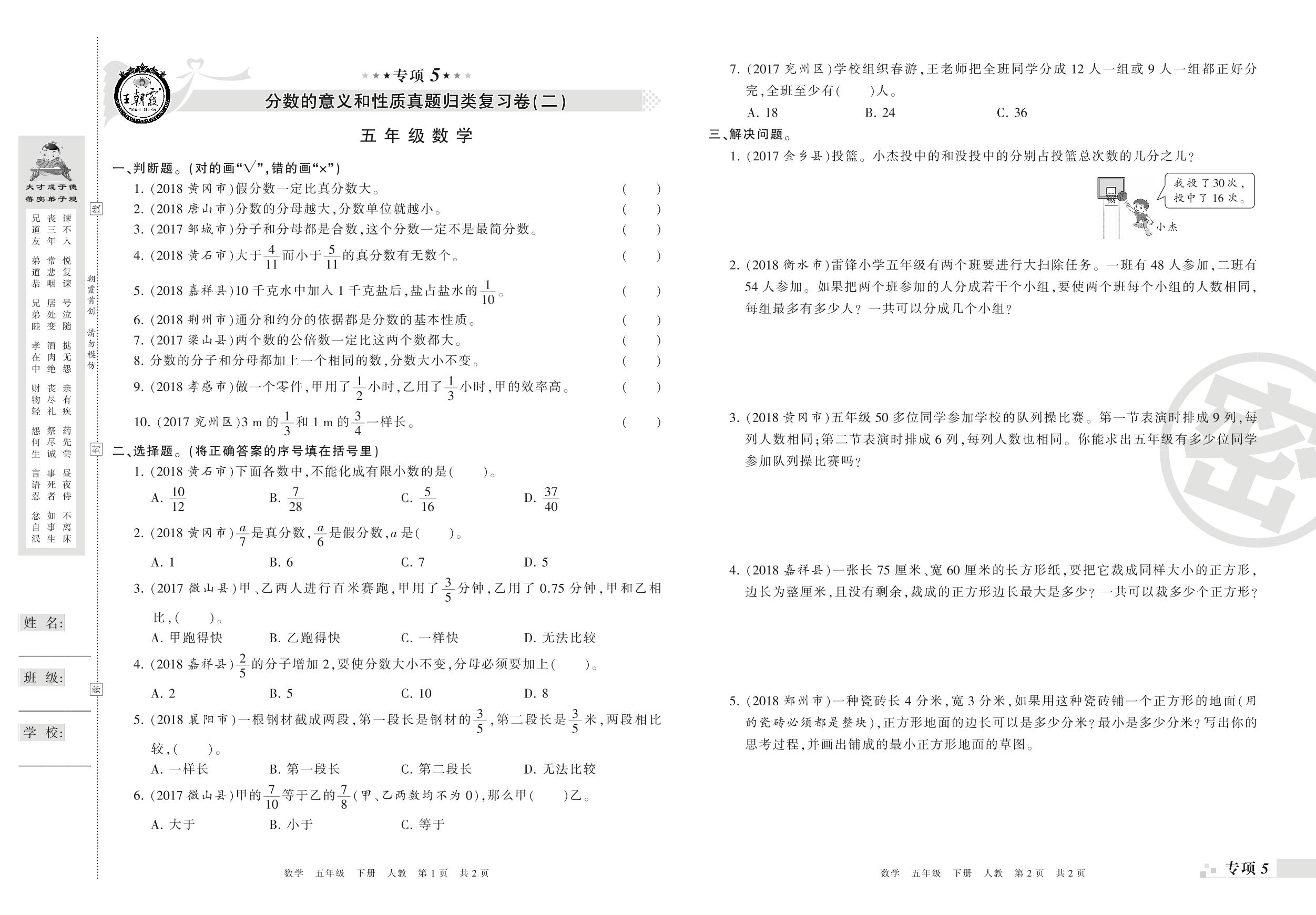 王朝霞期末专项卷——分数的意义和性质(二)、分数的加法和减法(一)真题归类复习卷五年级下册数学(人教版)_R210804174955002【0】