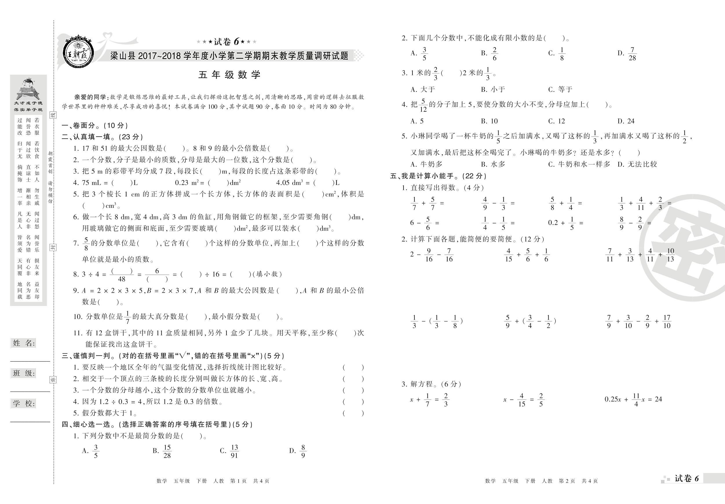 2017-2018学年第二学期济宁市梁山县五年级数学试卷(人教版)【6】