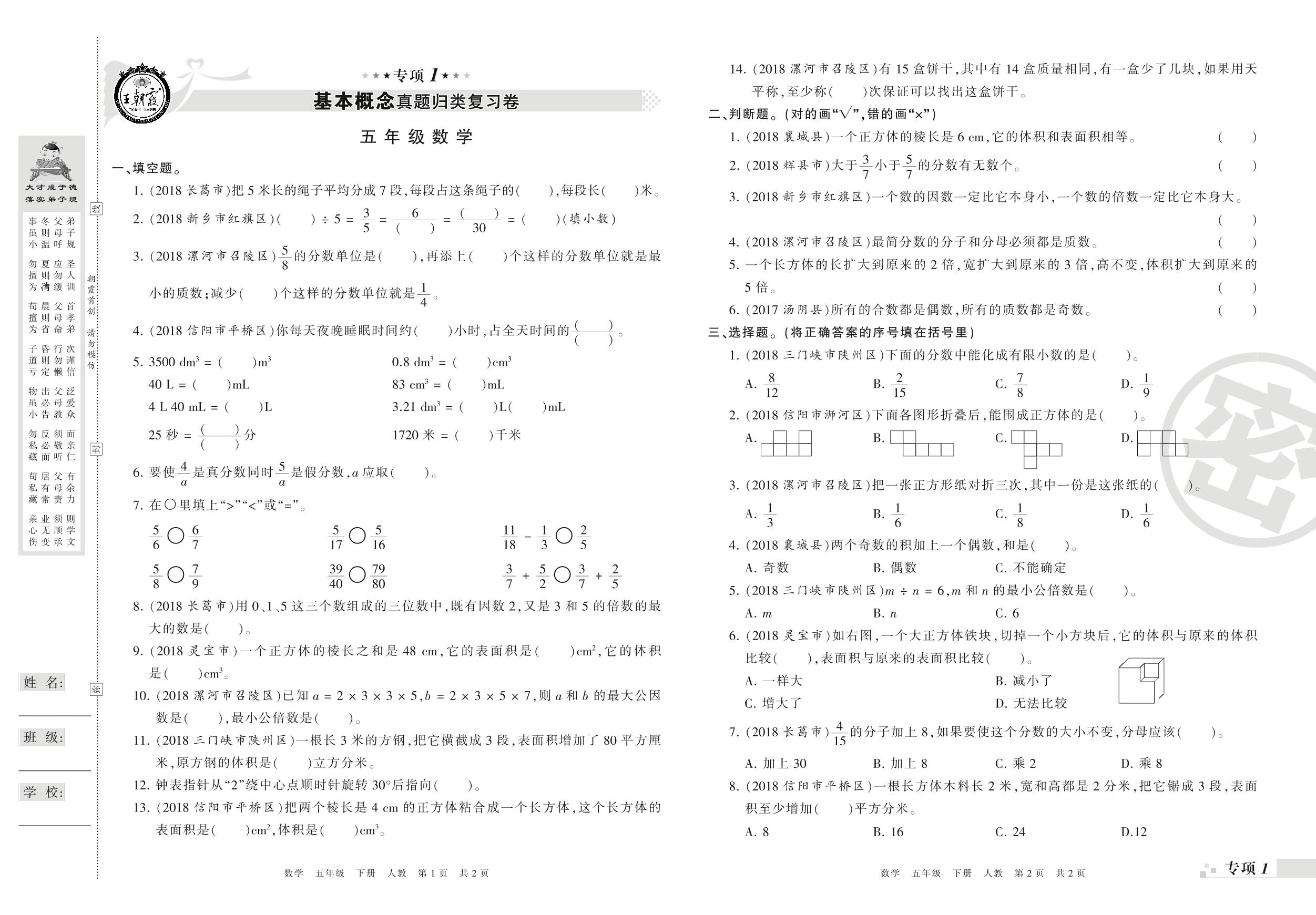 王朝霞期末专项卷——基本概念、计算真题归类复习卷五年级下册数学(人教版)_R210804175012【0】
