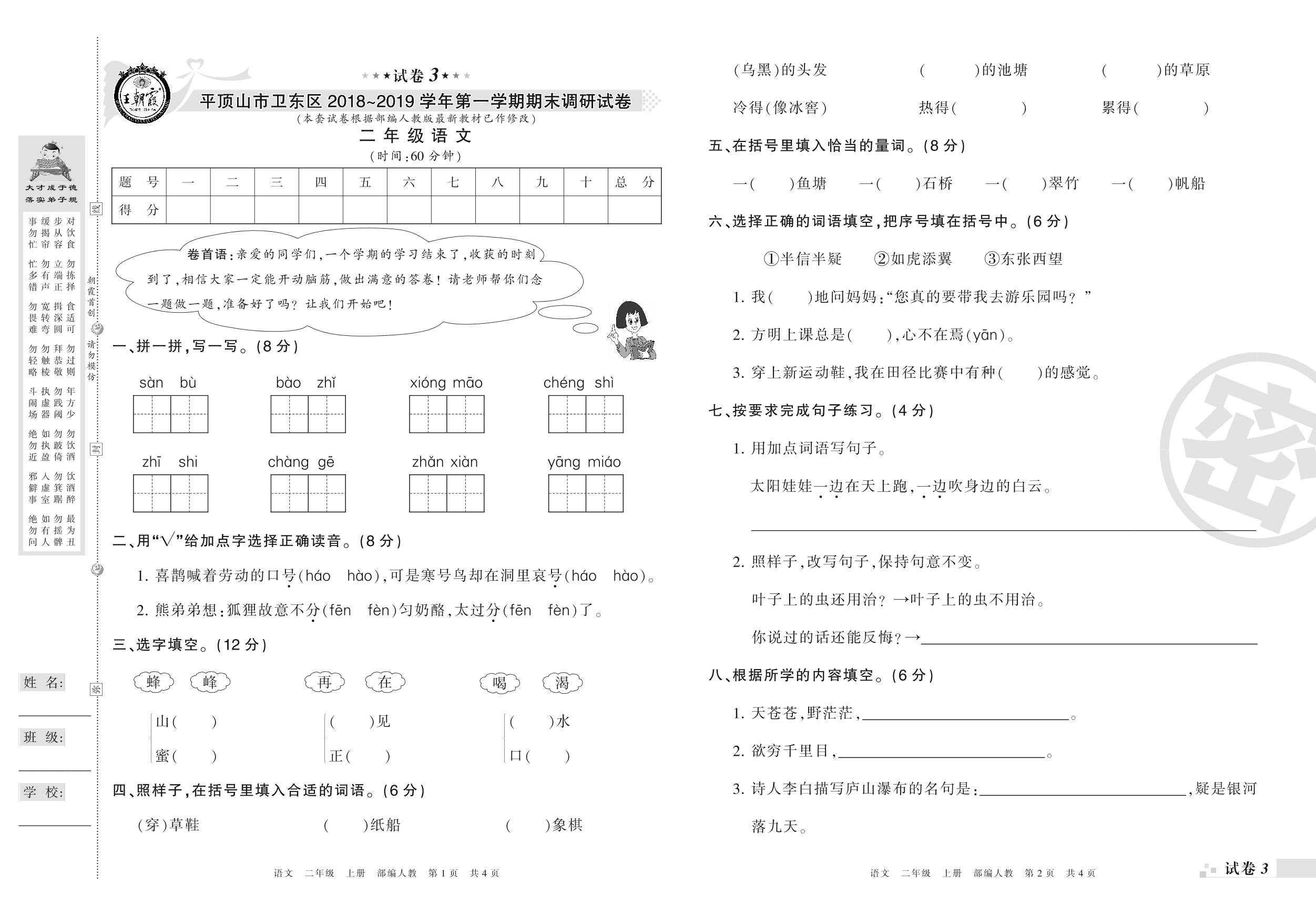 2018-2019学年第一学期平顶山市卫东区二年级语文试卷(人教版)【3】