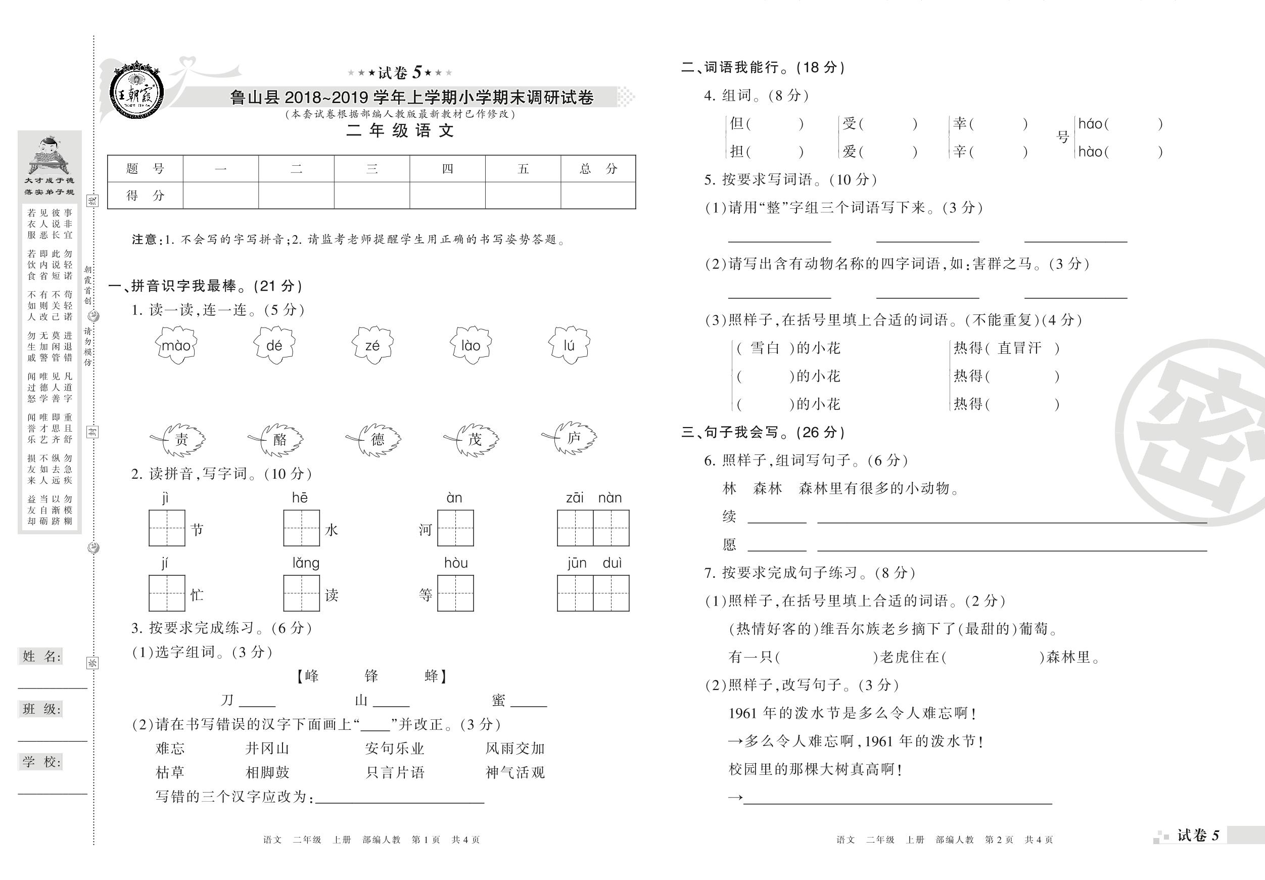 2018-2019学年第一学期平顶山市鲁山县二年级语文试卷(人教版)【5】
