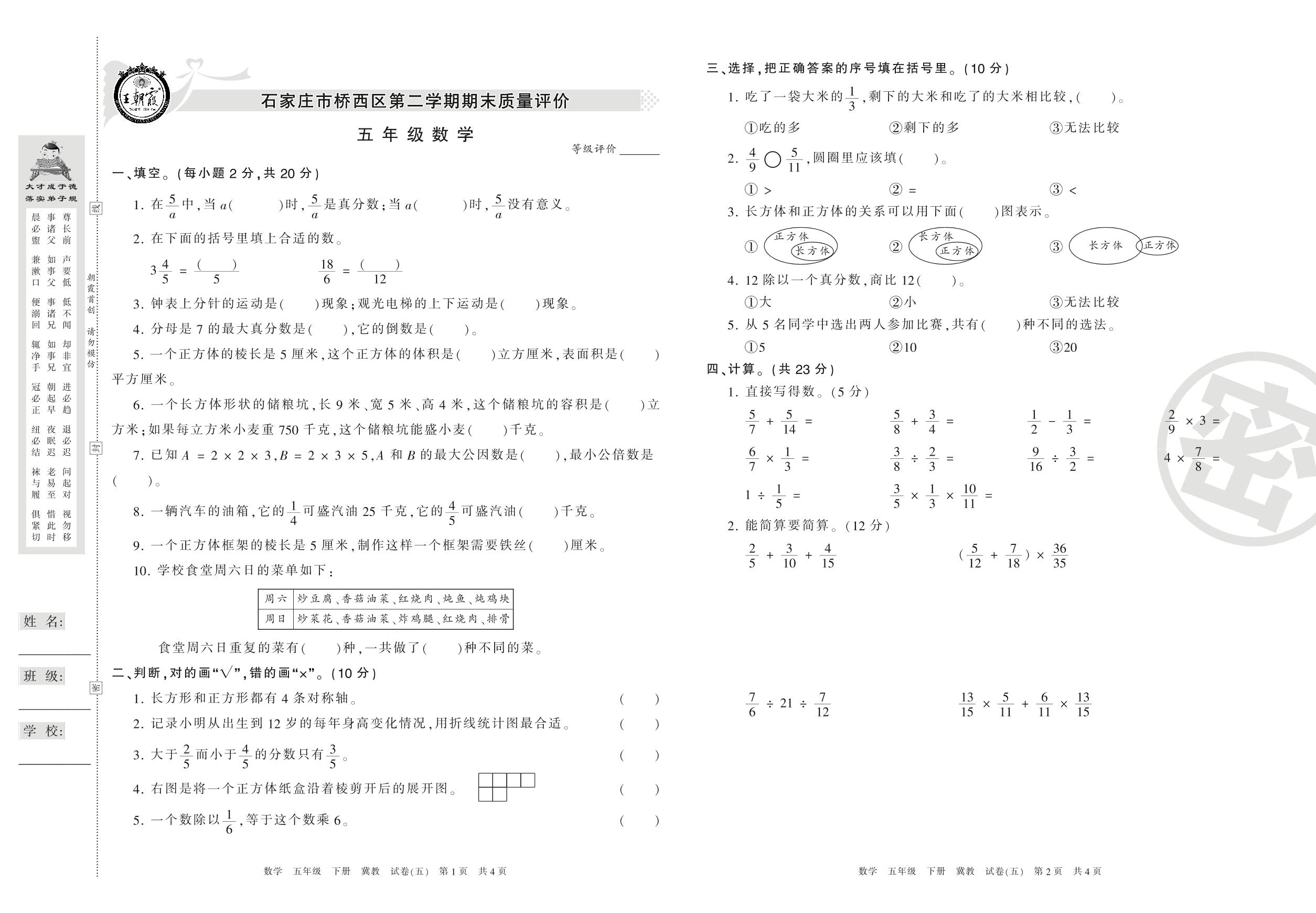 2015-2016学年第二学期石家庄市桥西区五年级数学试卷(冀教版)【5】