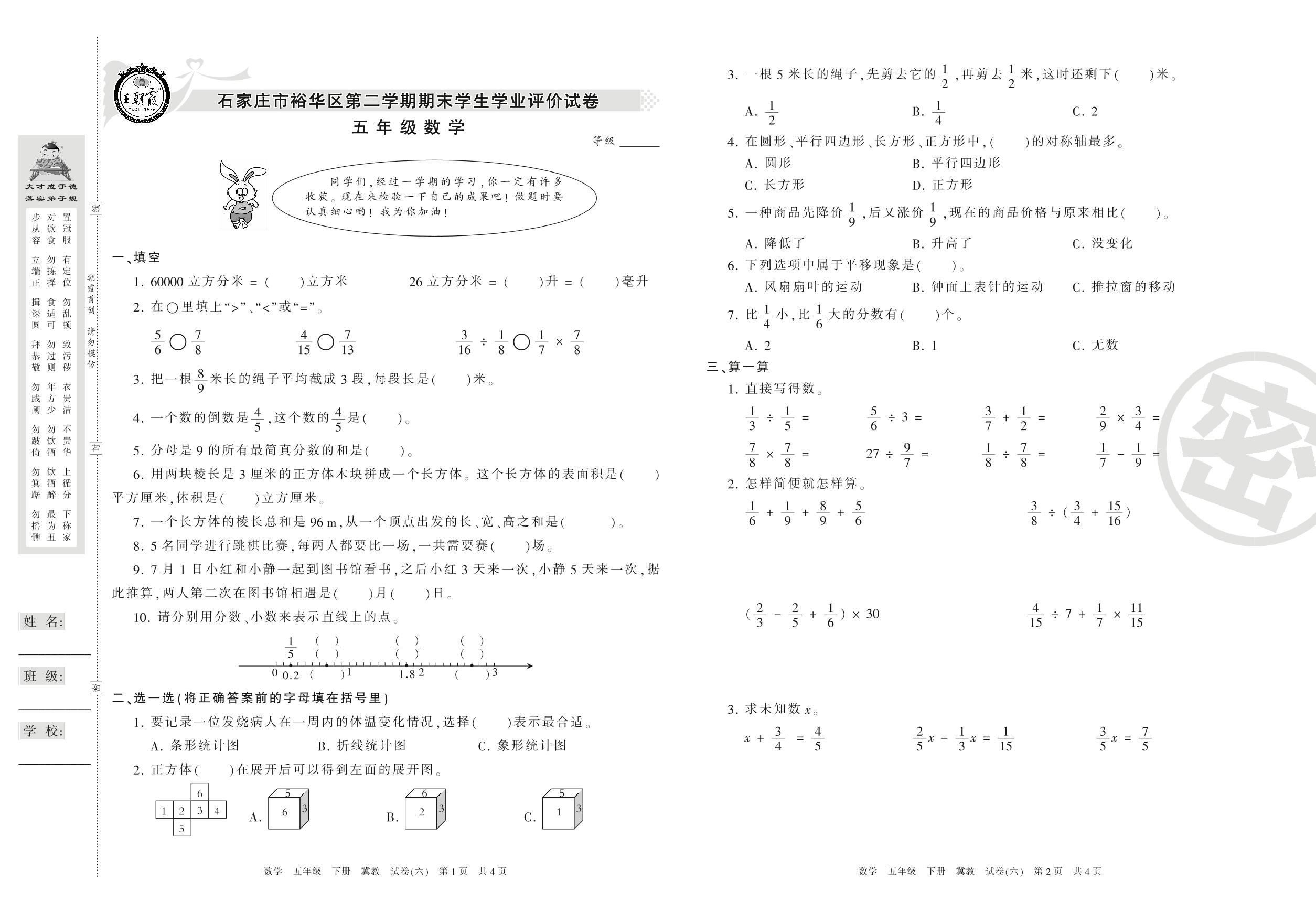 2015-2016学年第二学期石家庄市裕华区五年级数学试卷(冀教版)【6】