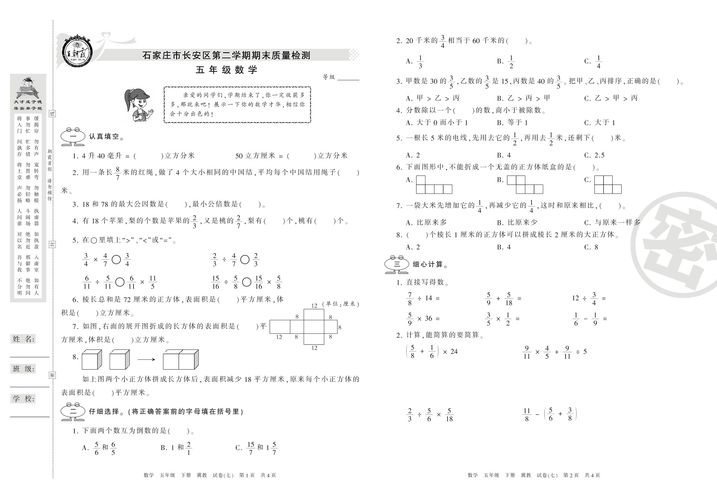 2015-2016学年第二学期石家庄市长安区五年级数学试卷(冀教版)【7】