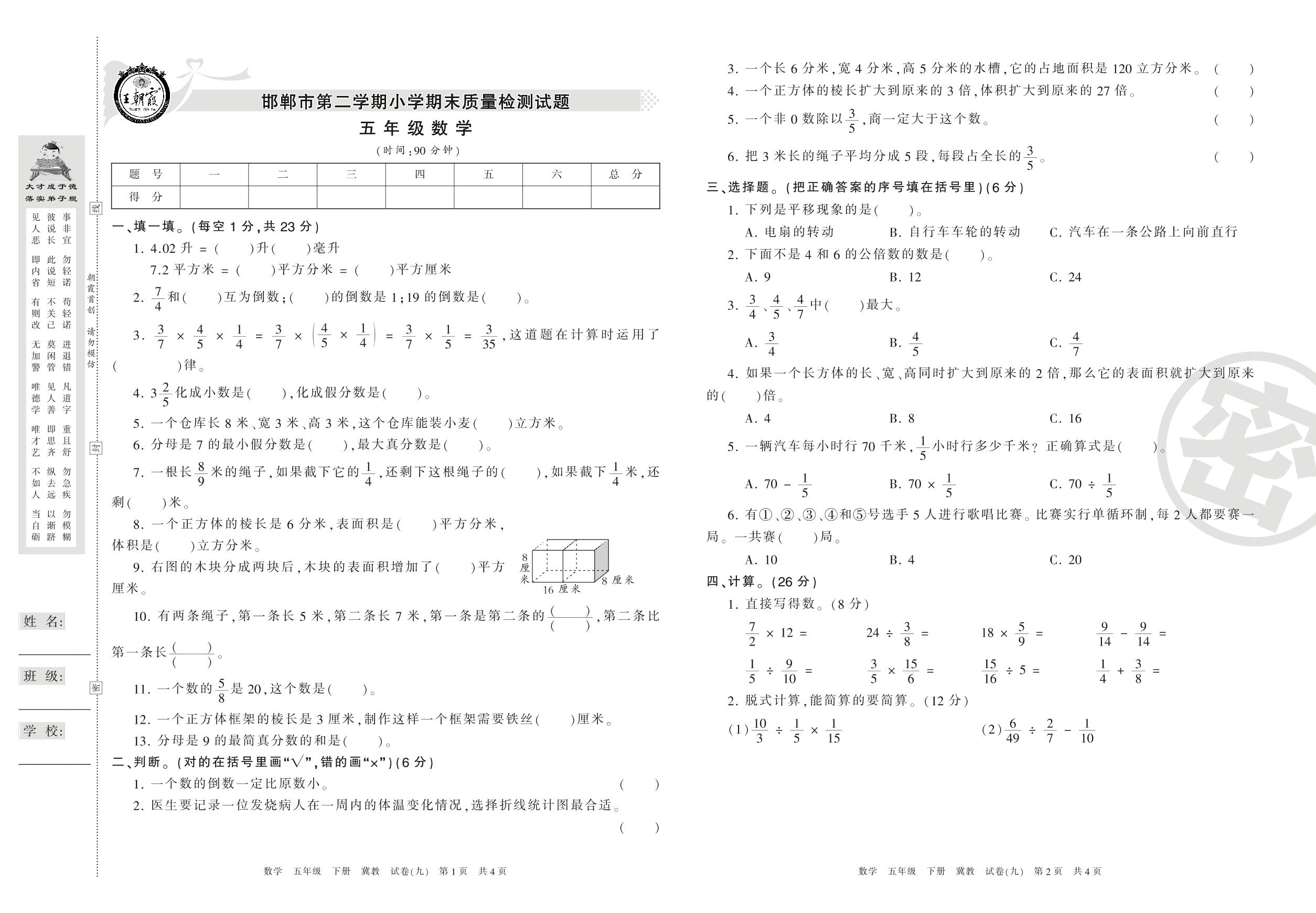 2015-2016学年第二学期邯郸市五年级数学试卷(冀教版)【9】