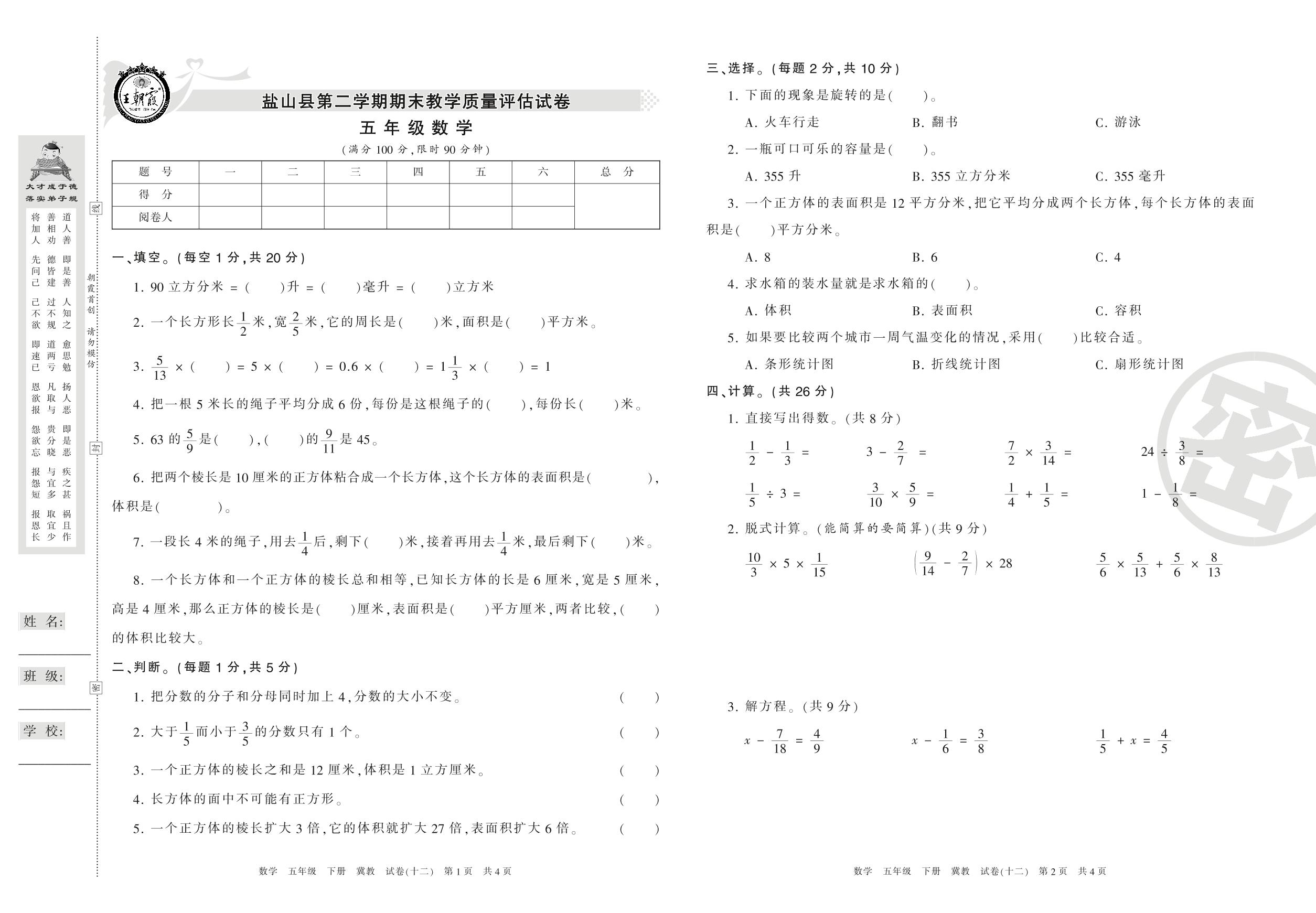 五年级数学冀教版下册期末卷