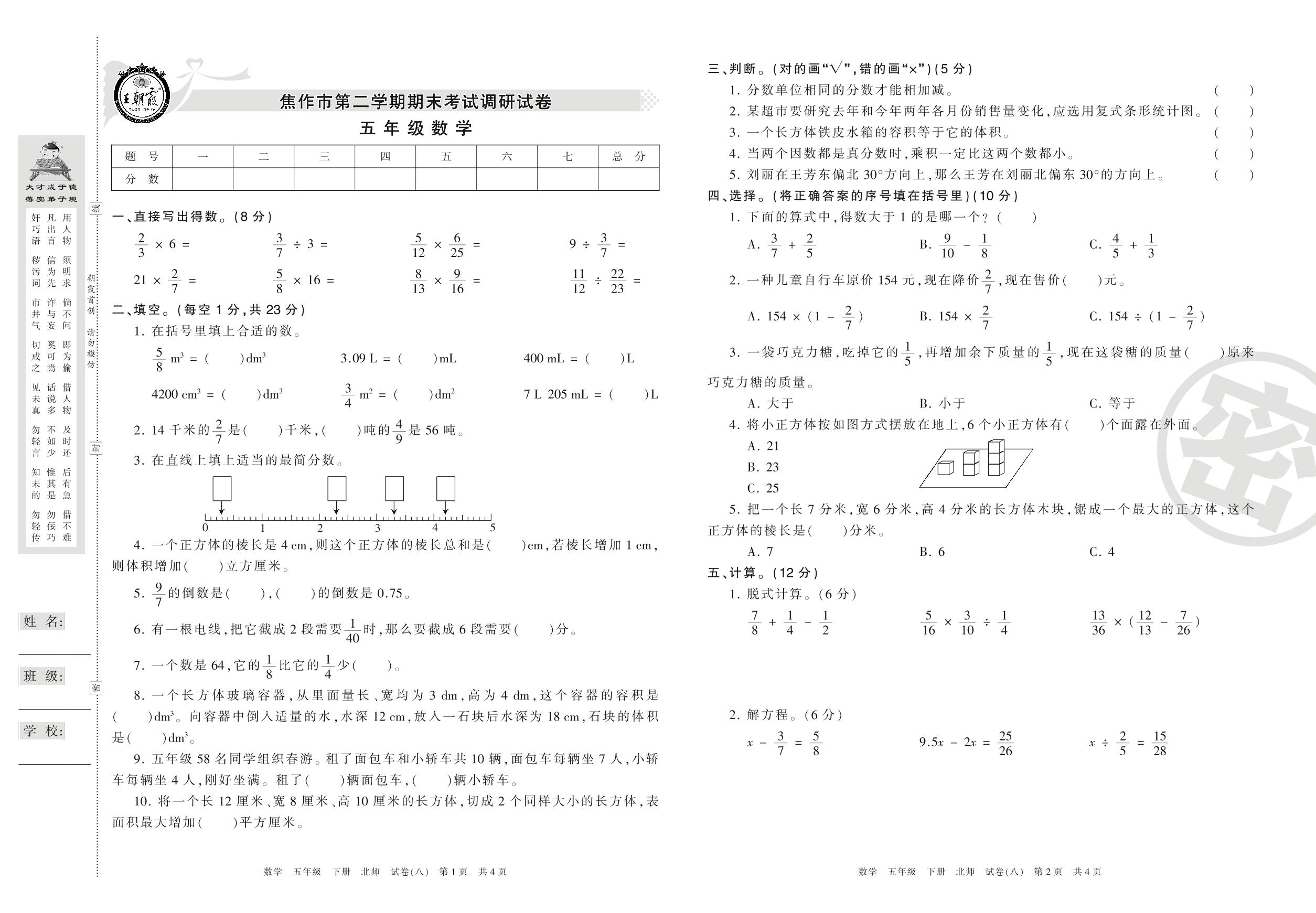 2015-2016学年第二学期焦作市五年级数学试卷(北师版)【8】