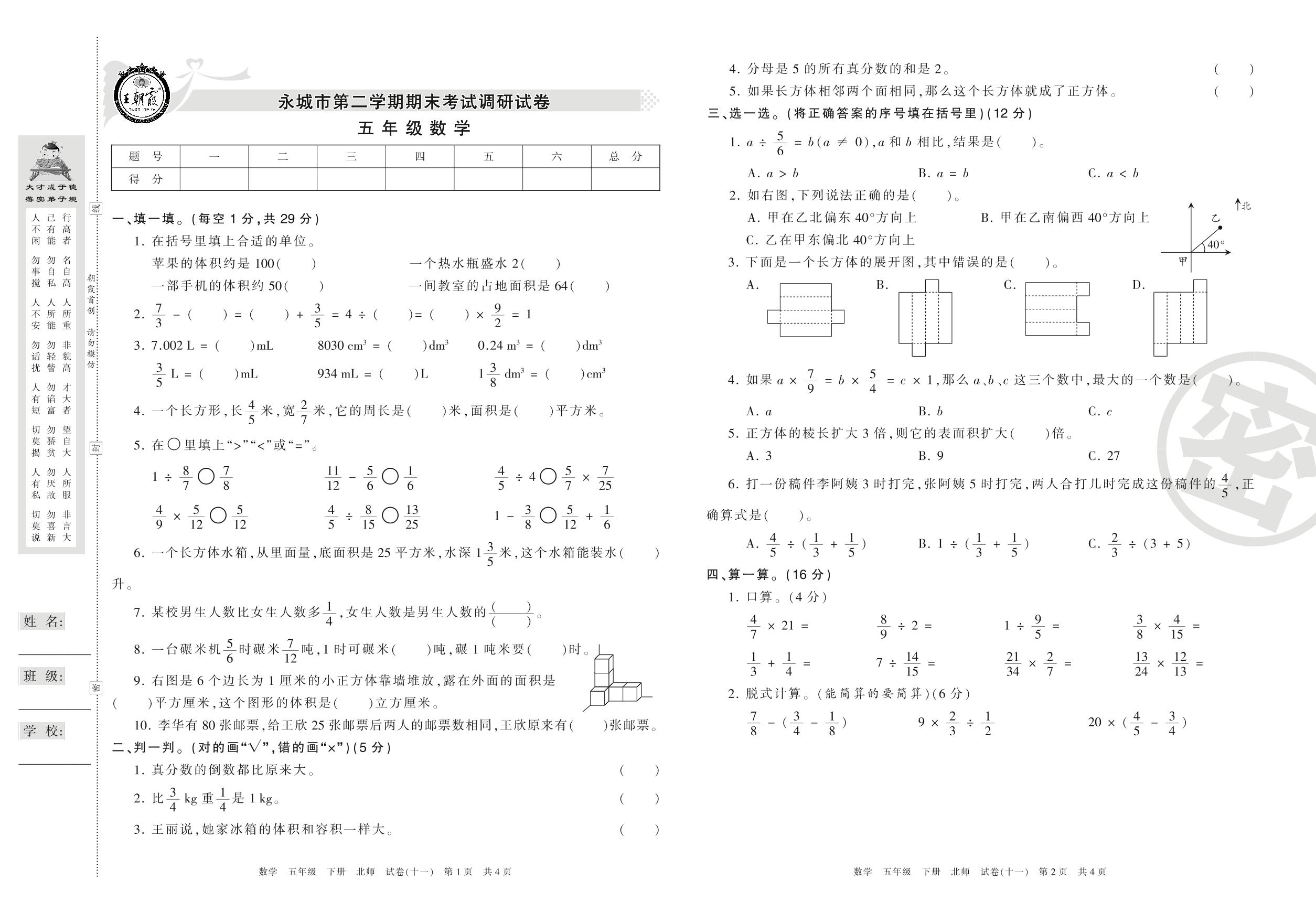 2015-2016学年第二学期永城市五年级数学试卷(北师版)【11】