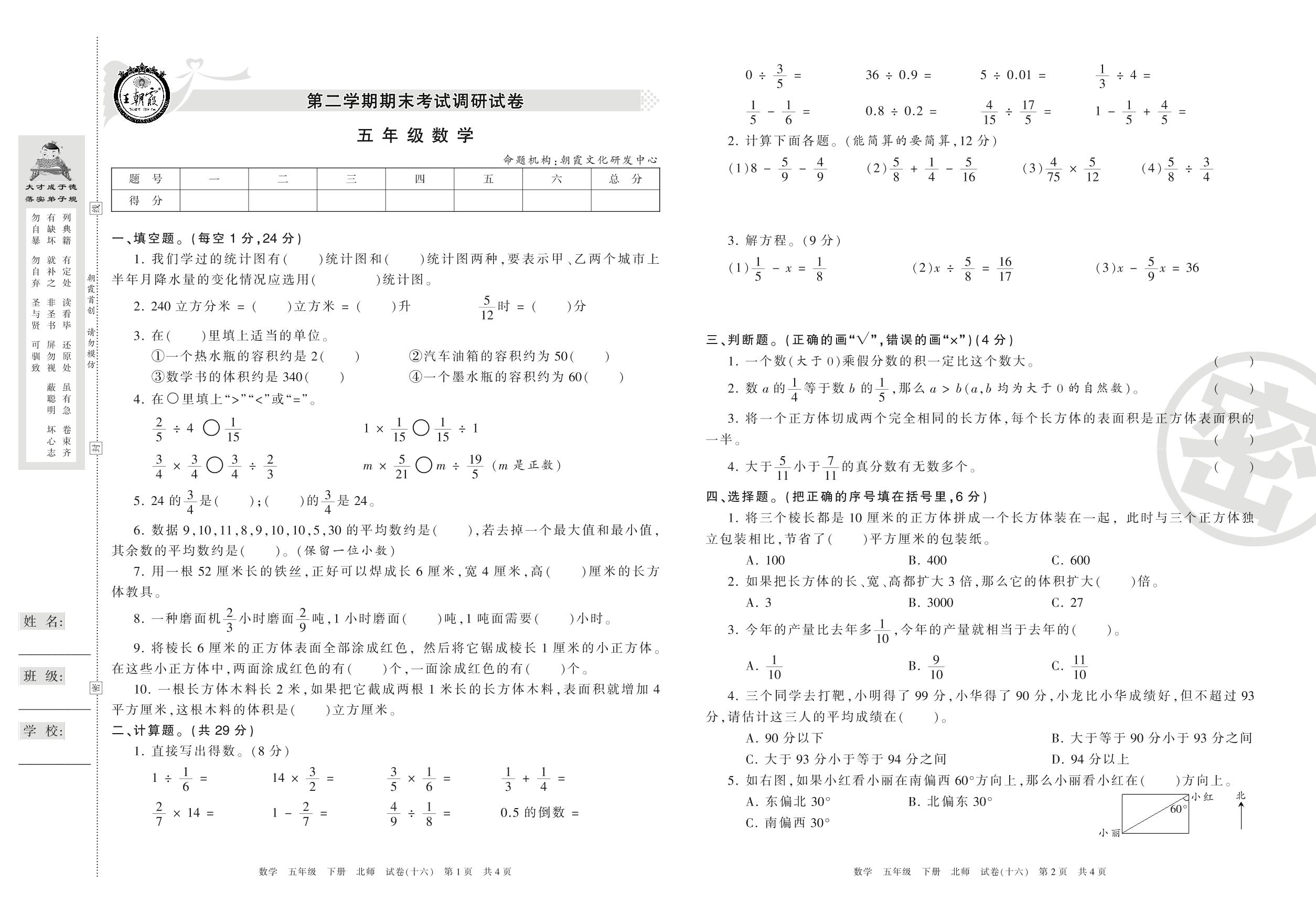 王朝霞期末调研卷五年级下册数学(北师版)【16】