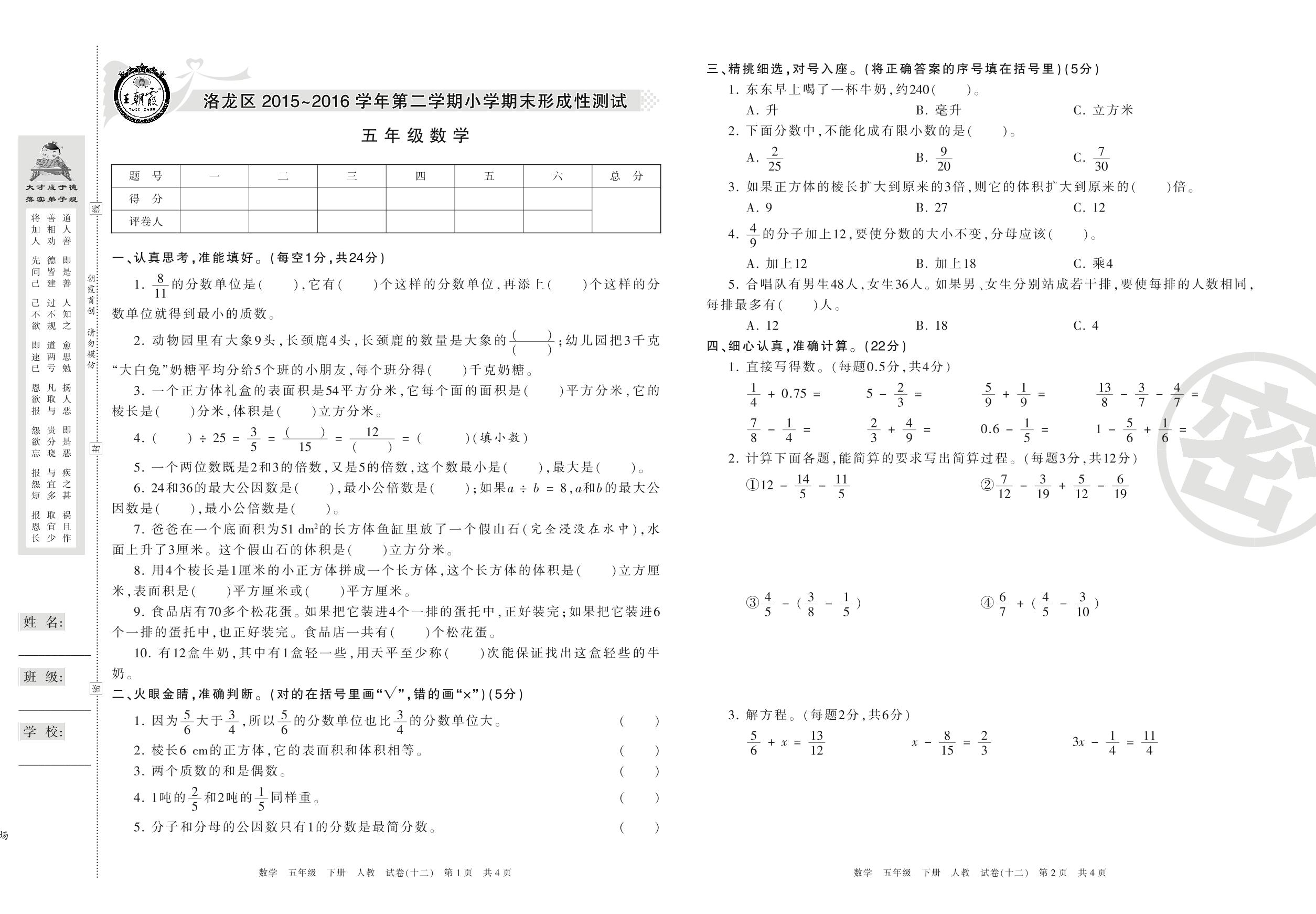 2015-2016学年第二学期洛阳市洛龙区五年级数学试卷(人教版)【12】