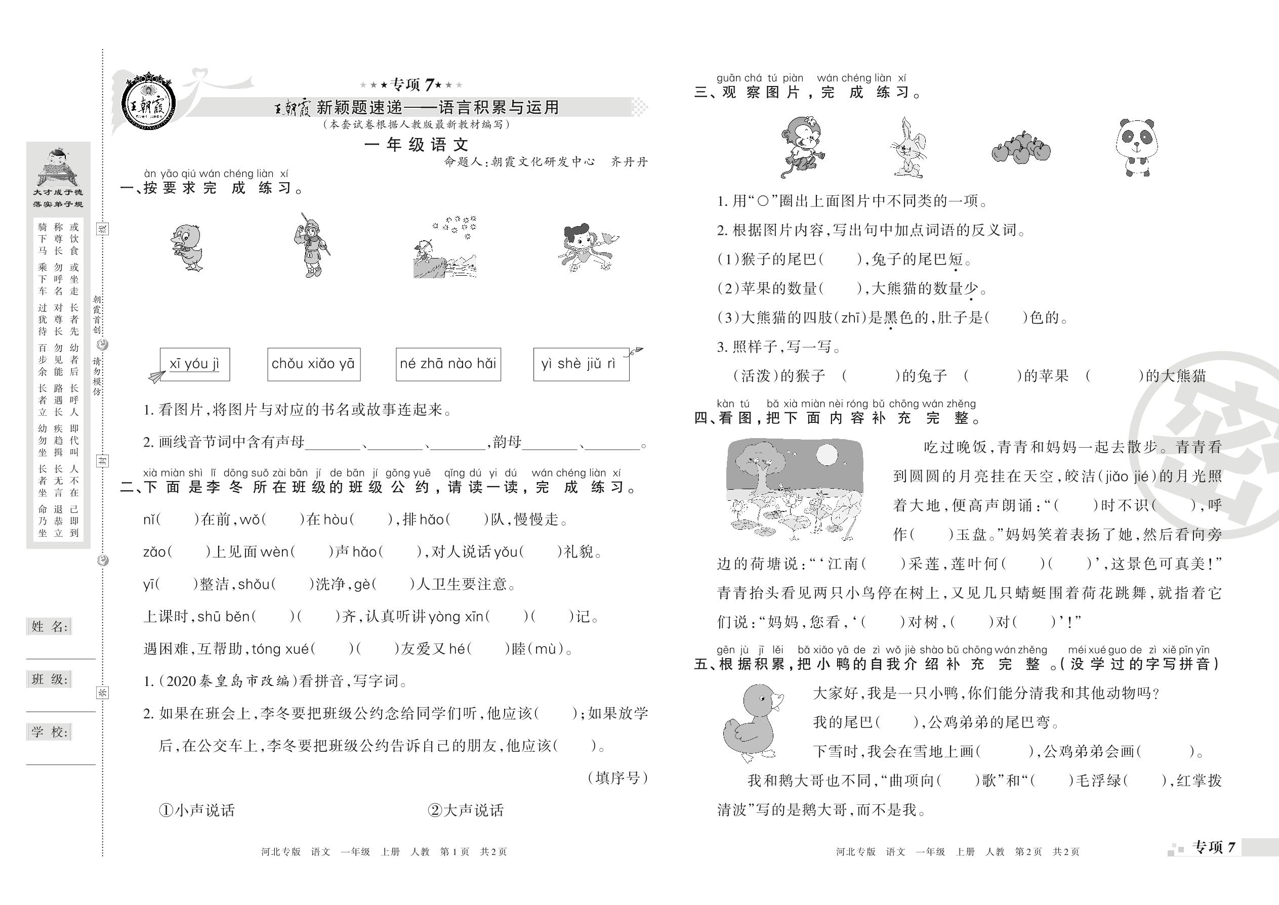 王朝霞期末专项卷——语言积累与运用、非连续性文本阅读一年级上册语文(人教版)_R211022153321351【0】