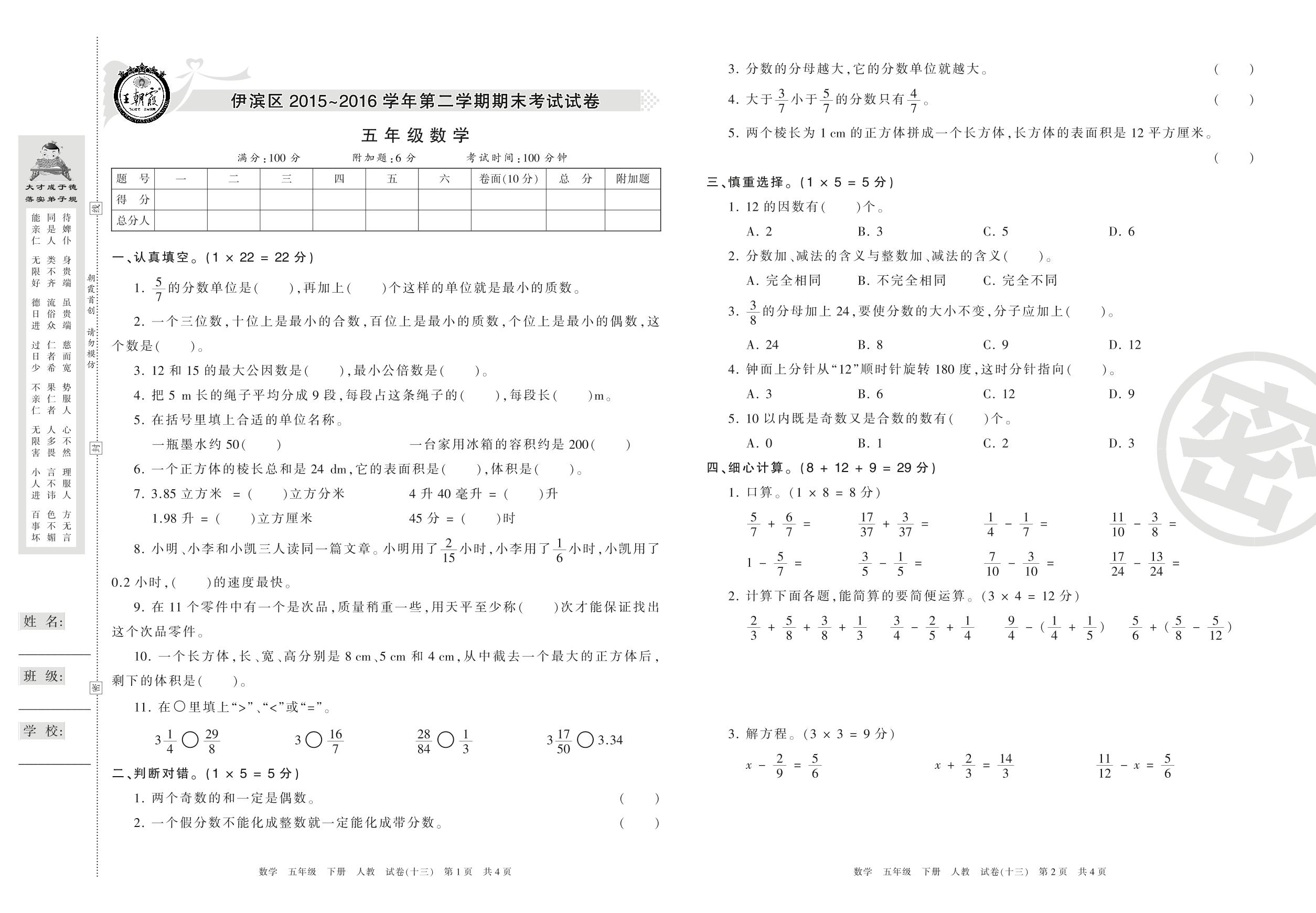 2015-2016学年第二学期洛阳市伊滨区五年级数学试卷(人教版)【13】