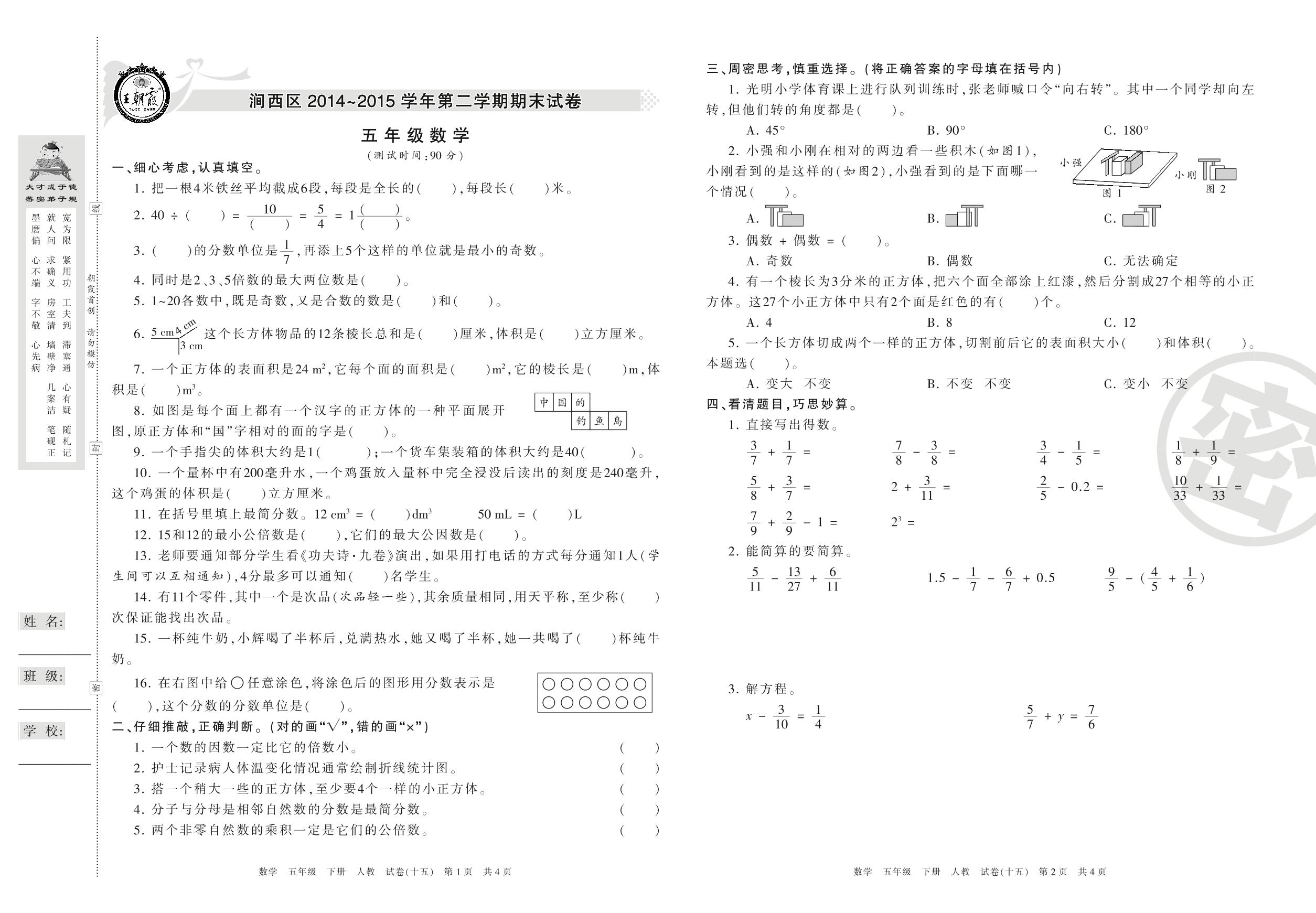 2014-2015学年第二学期洛阳市涧西区五年级数学试卷(人教版)【15】