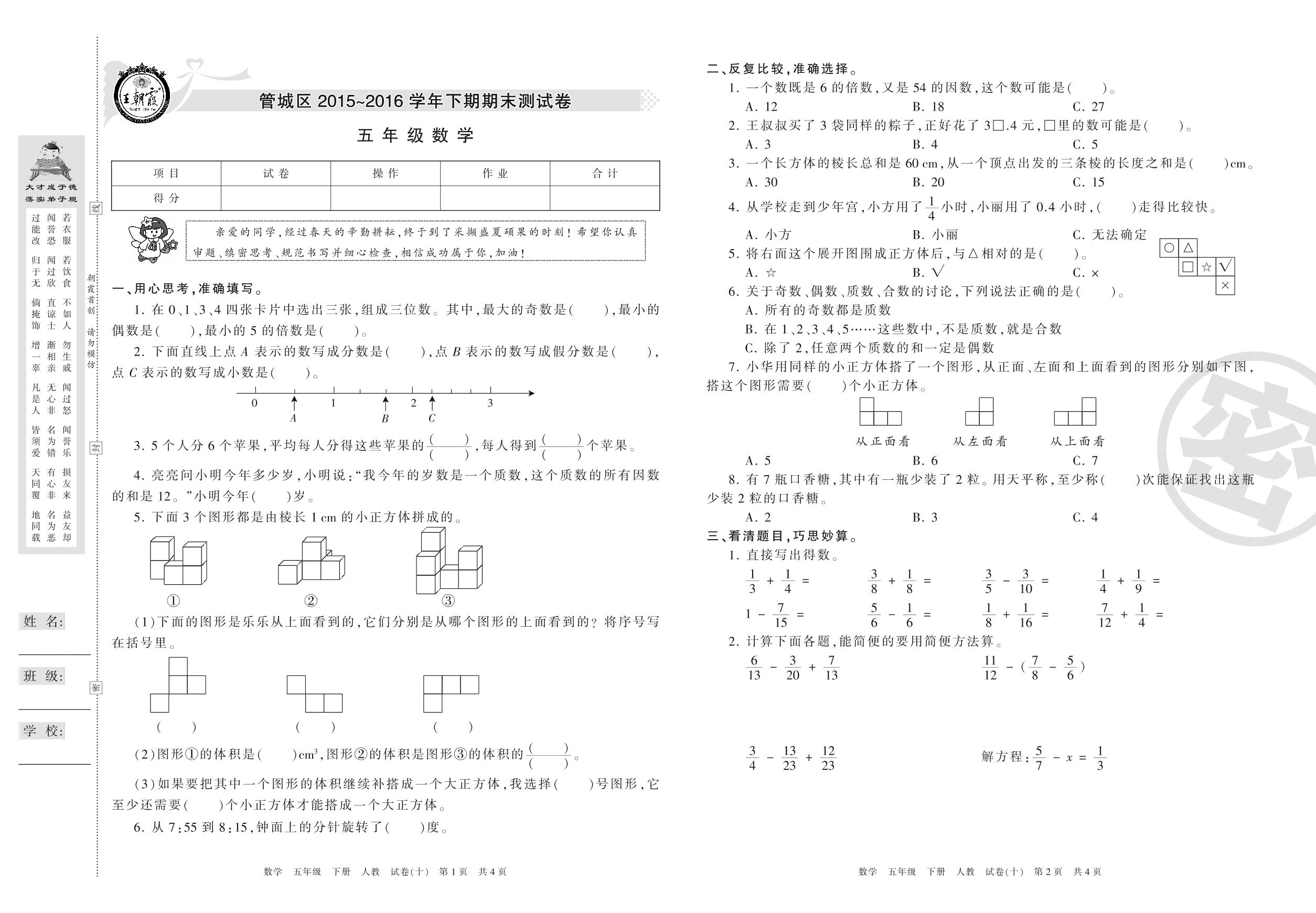 2015-2016学年第二学期郑州市管城区五年级数学试卷(人教版)【10】