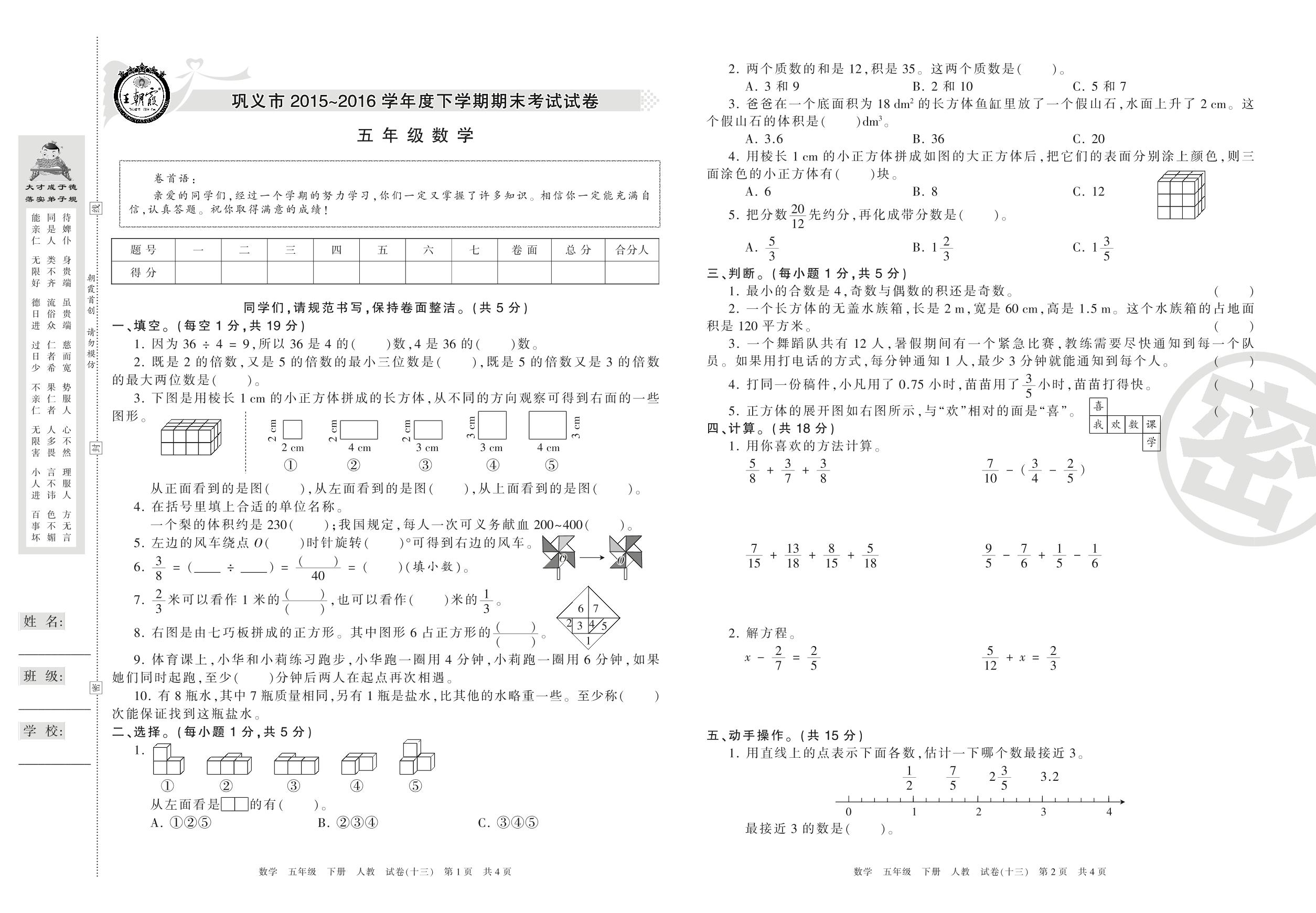2015-2016学年第二学期巩义市五年级数学试卷(人教版)【13】
