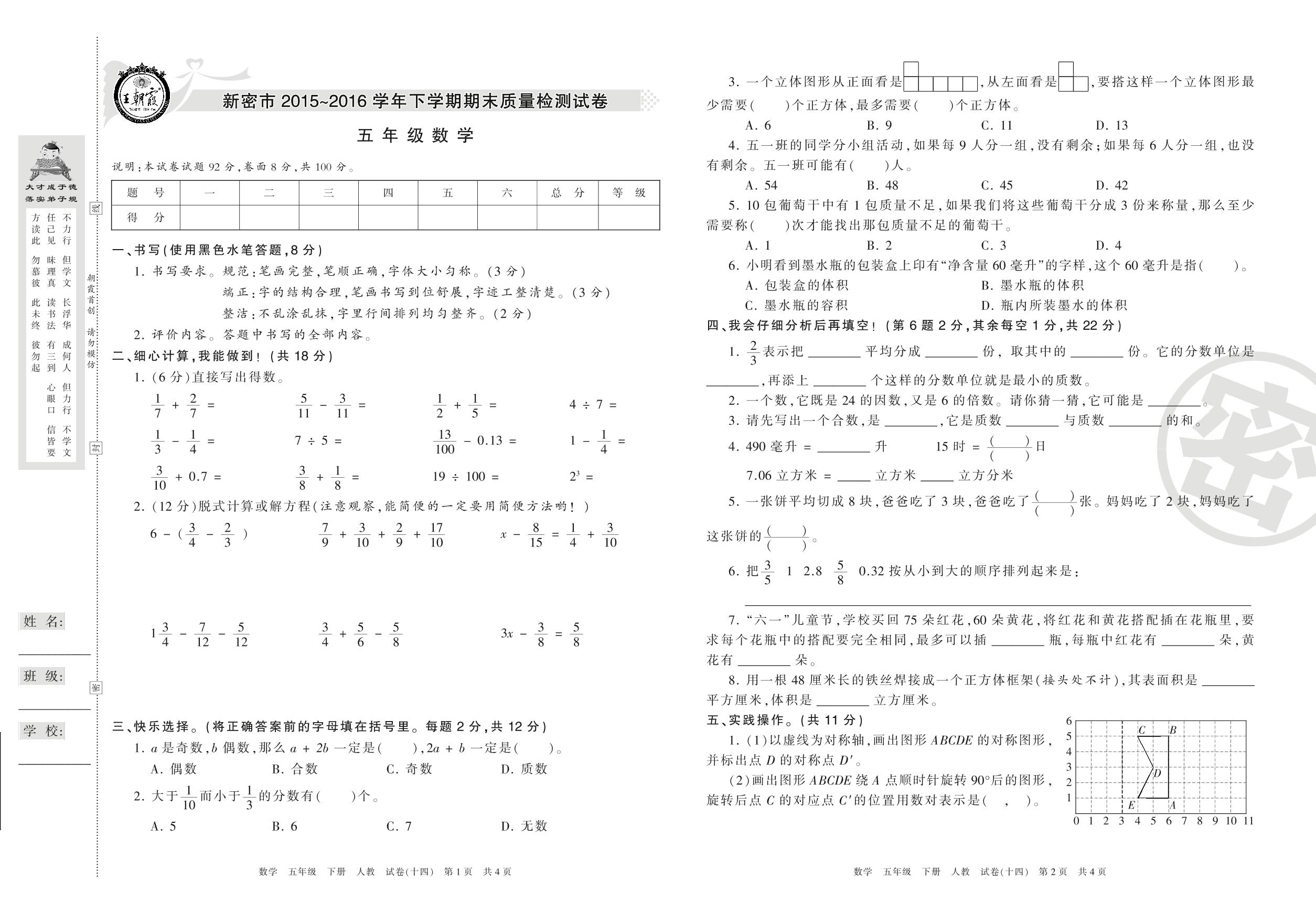 2015-2016学年第二学期新密市五年级数学试卷(人教版)【14】