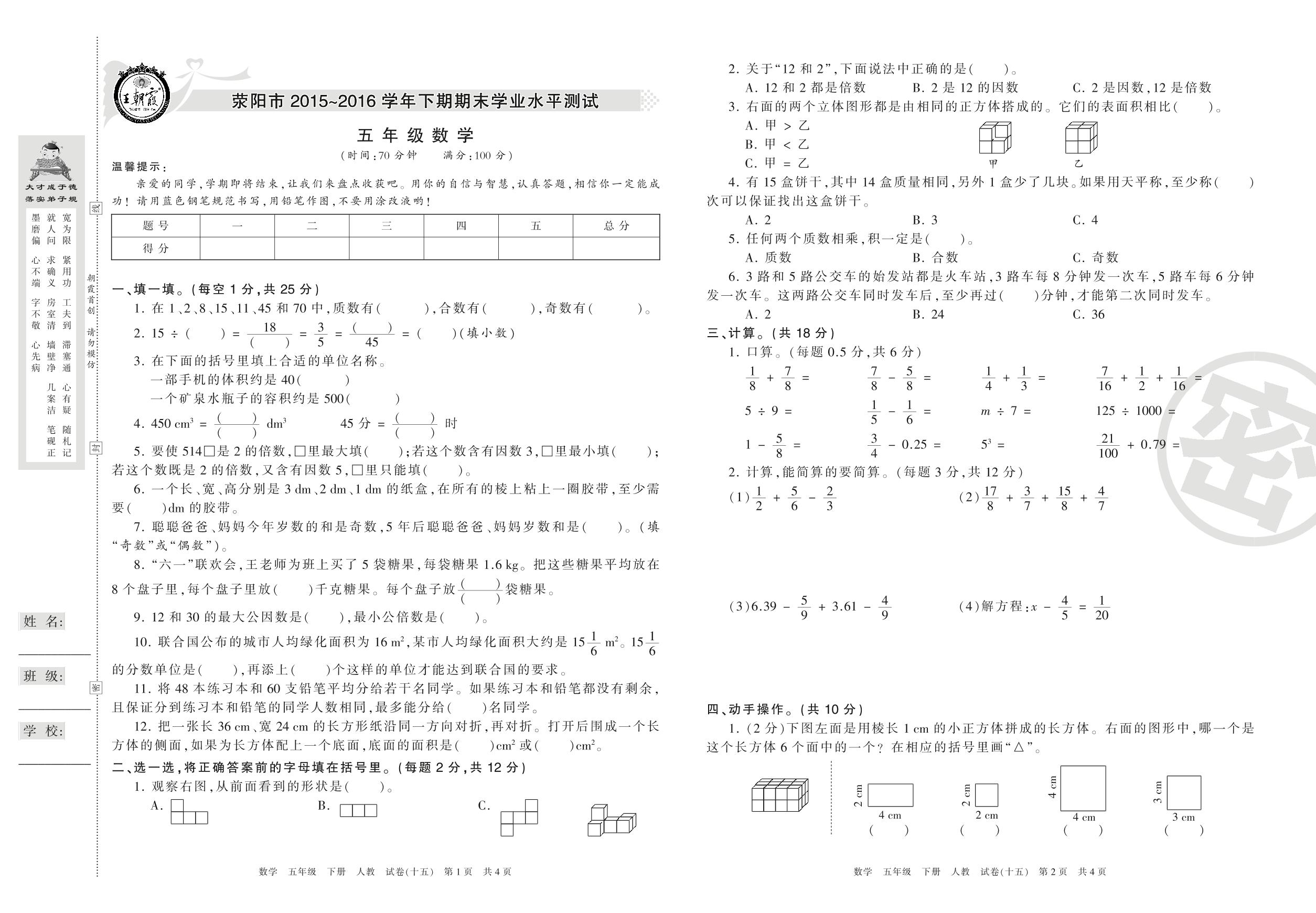 2015-2016学年第二学期荥阳市五年级数学试卷(人教版)【15】