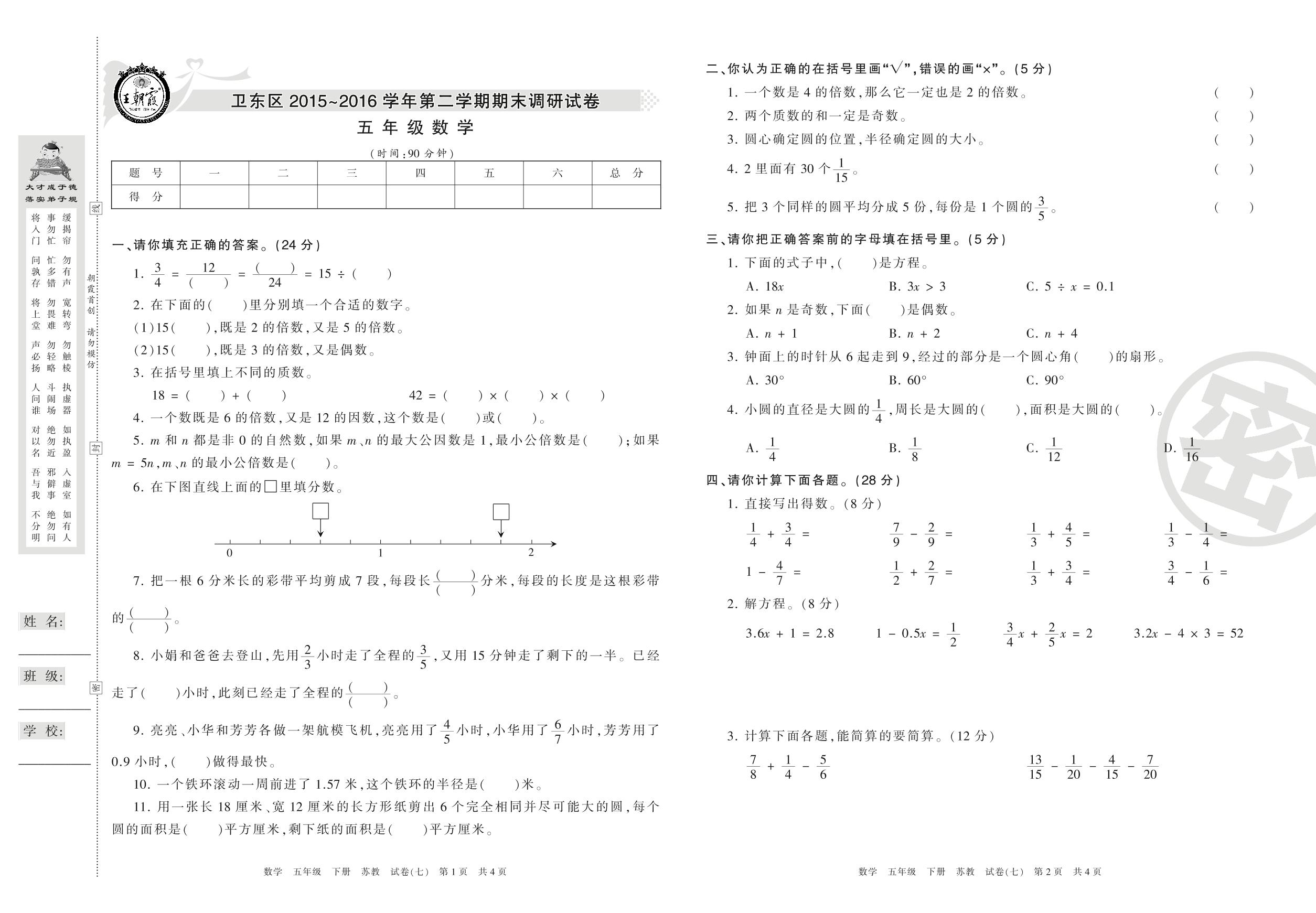 2015-2016学年第二学期卫东市五年级数学试卷(苏教版)【7】