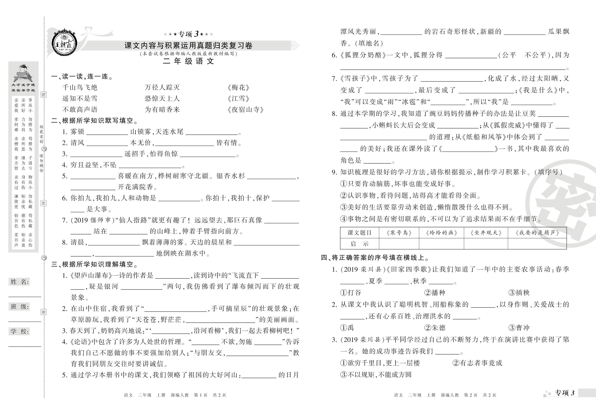 王朝霞期末专项卷——课文内容与积累运用、口语交际与写话真题归类复习卷二年级上册语文(人教版)_R21080171444【0】