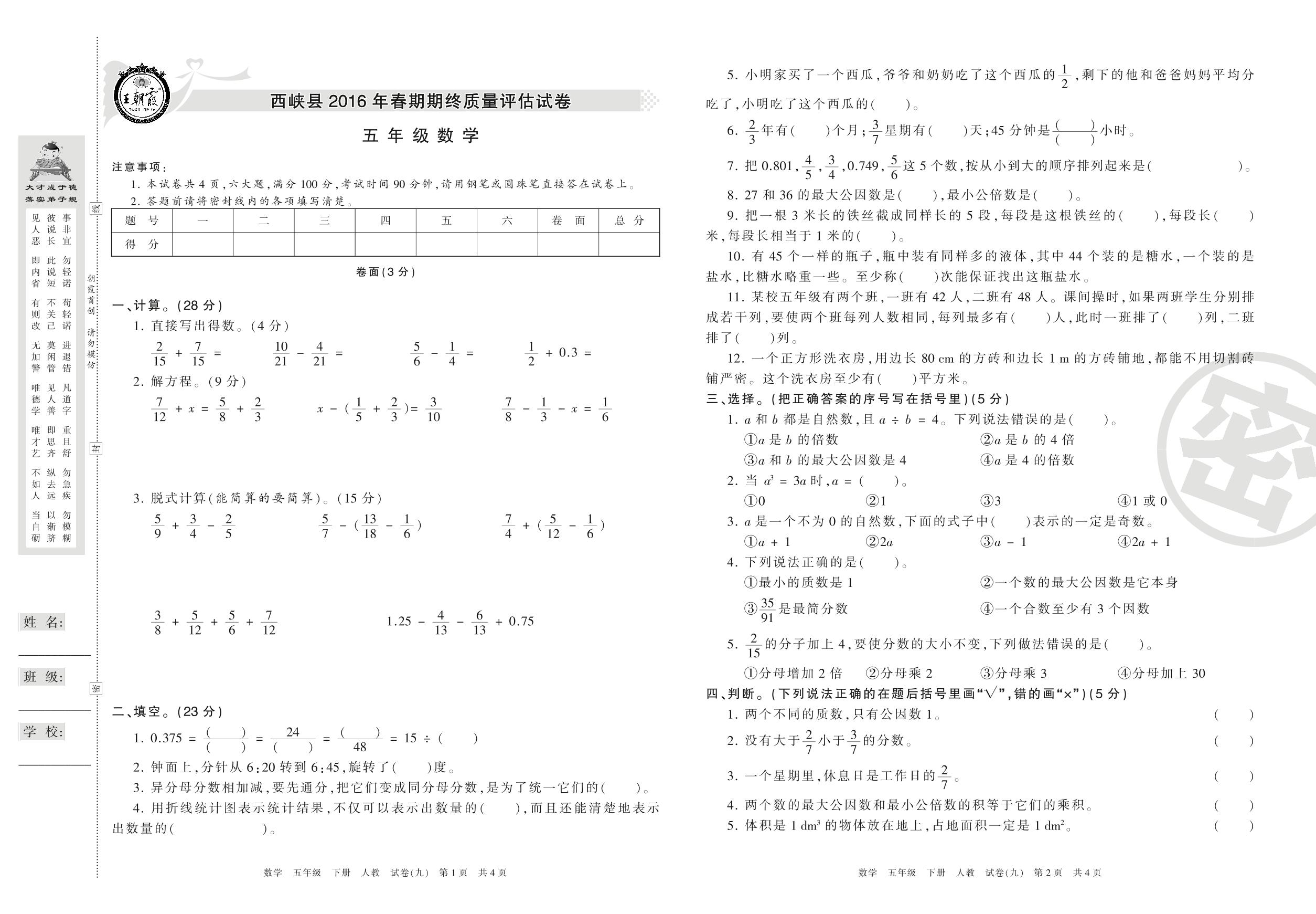 2015-2016学年第二学期南阳市西峡县五年级数学试卷(人教版)【9】