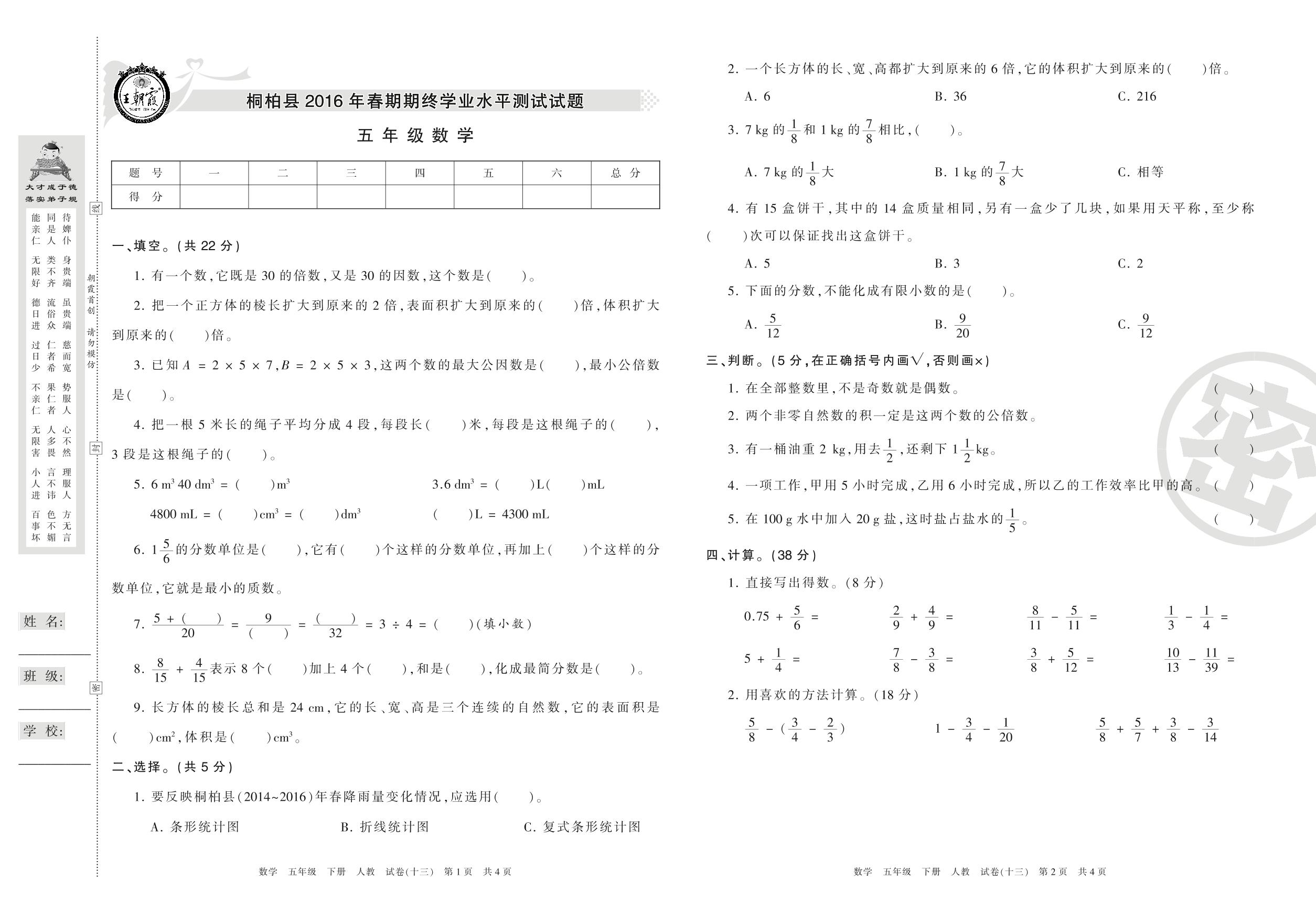 2015-2016学年第二学期南阳市桐柏县五年级数学试卷(人教版)【13】