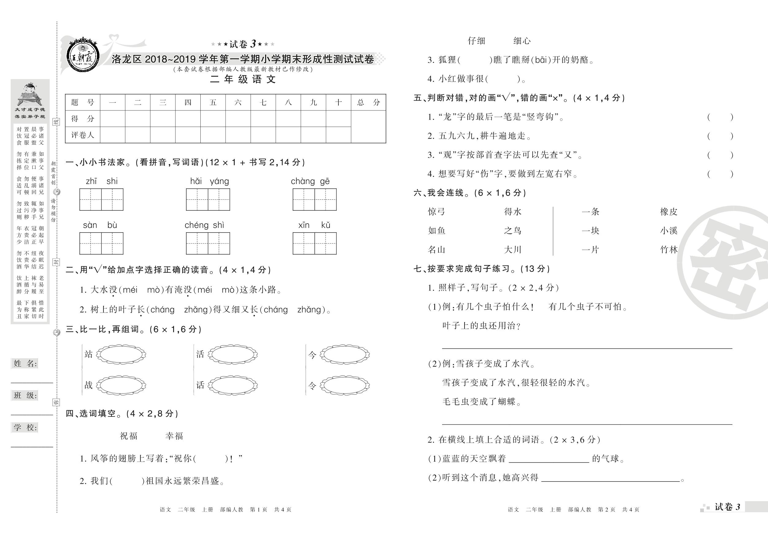 2018-2019学年第一学期洛阳市洛龙区二年级语文试卷(人教版)【3】