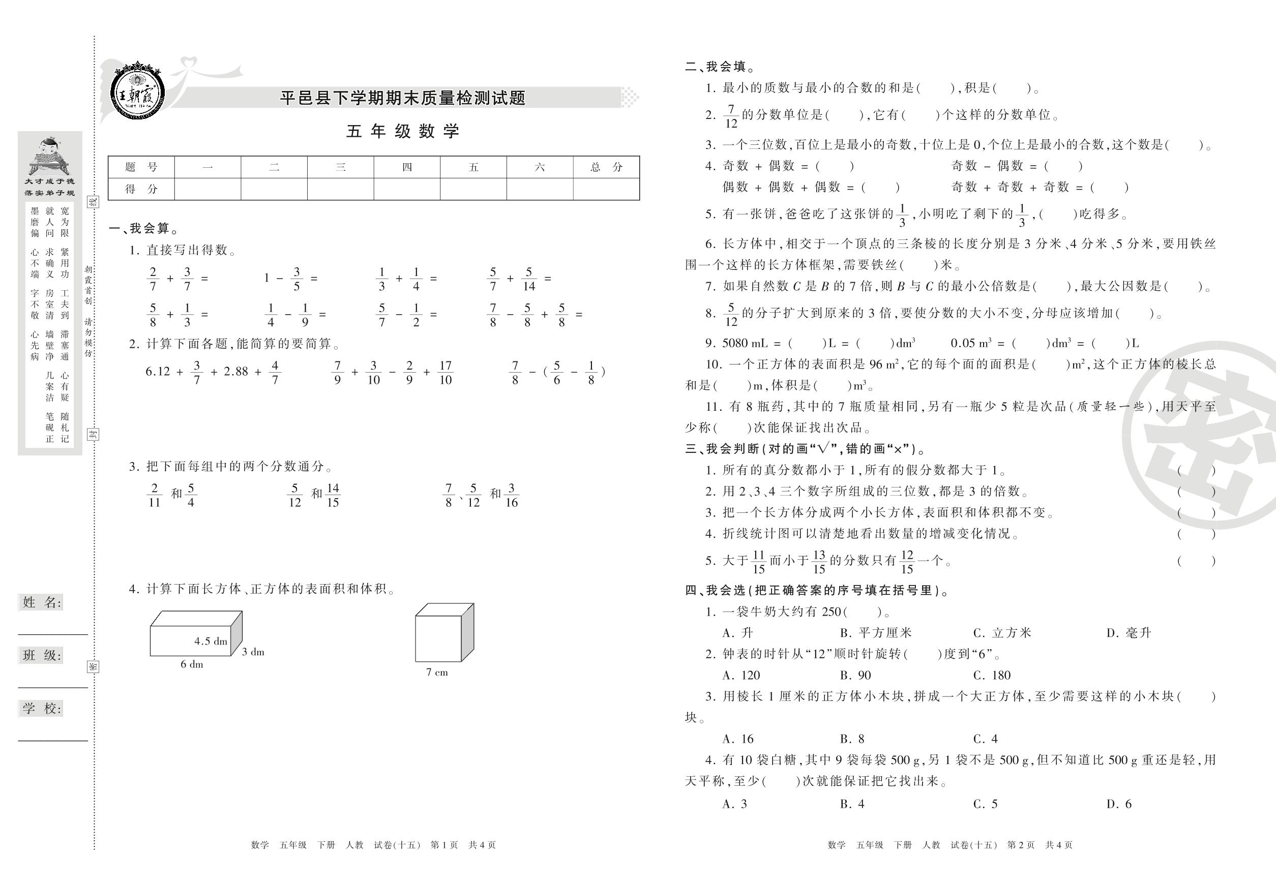 2015-2016学年第二学期临沂市平邑县五年级数学试卷(人教版)【15】