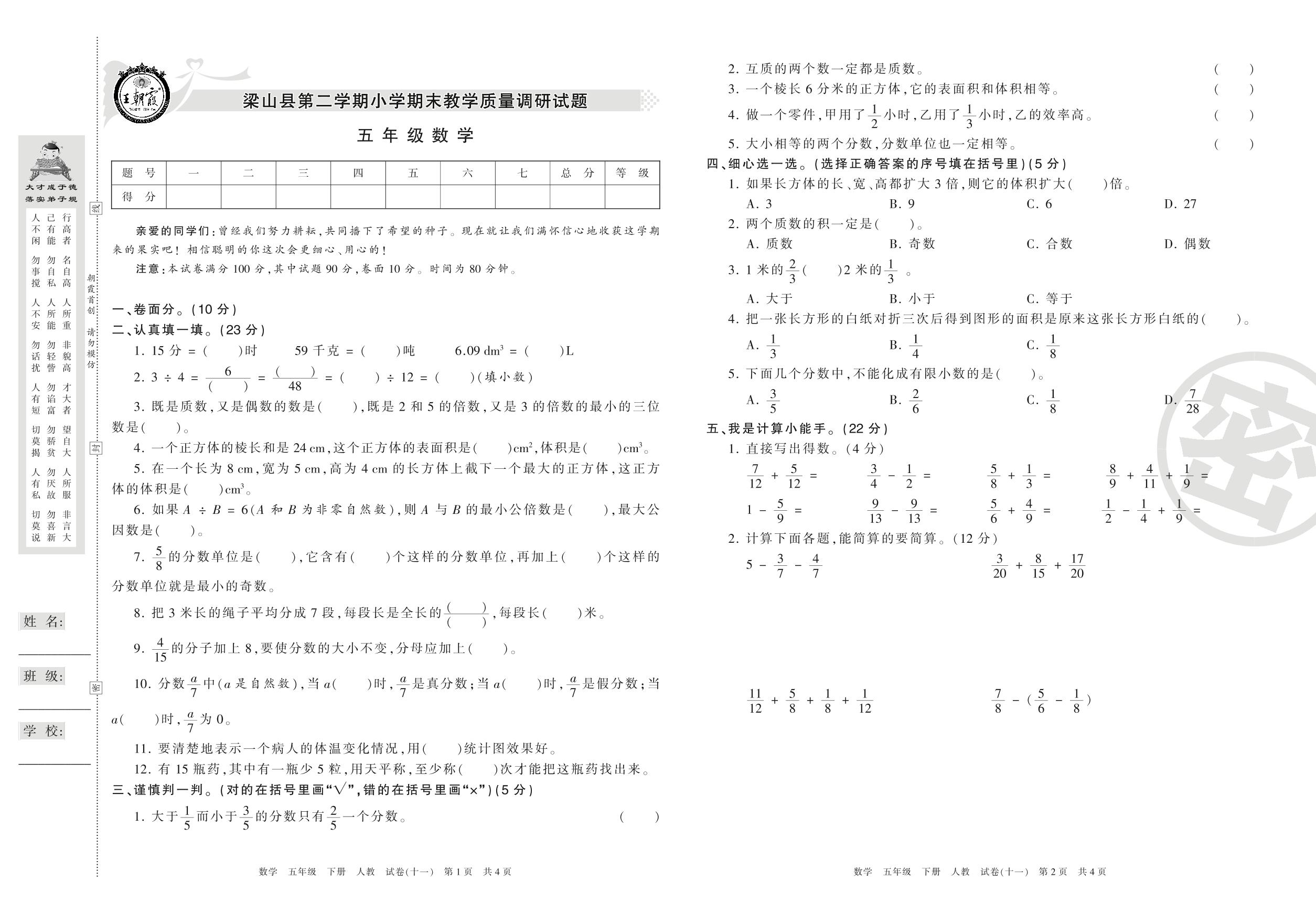 2015-2016学年第二学期济宁市梁山县五年级数学试卷(人教版)【11】