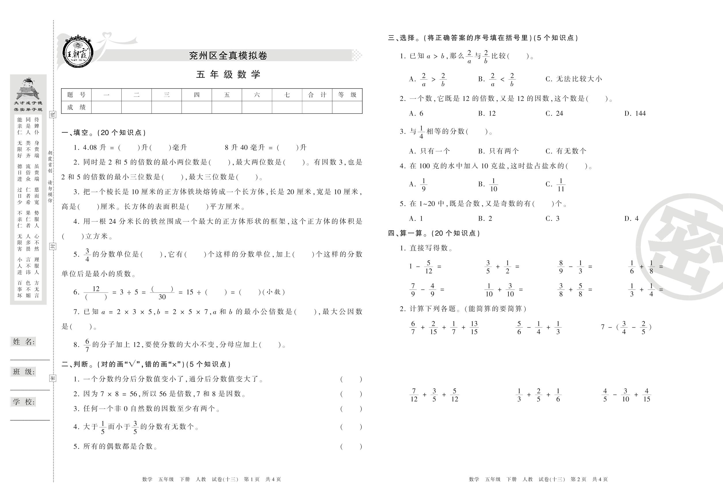 2015-2016学年第二学期济宁市兖州区全真模拟卷五年级数学试卷(人教版)【13】