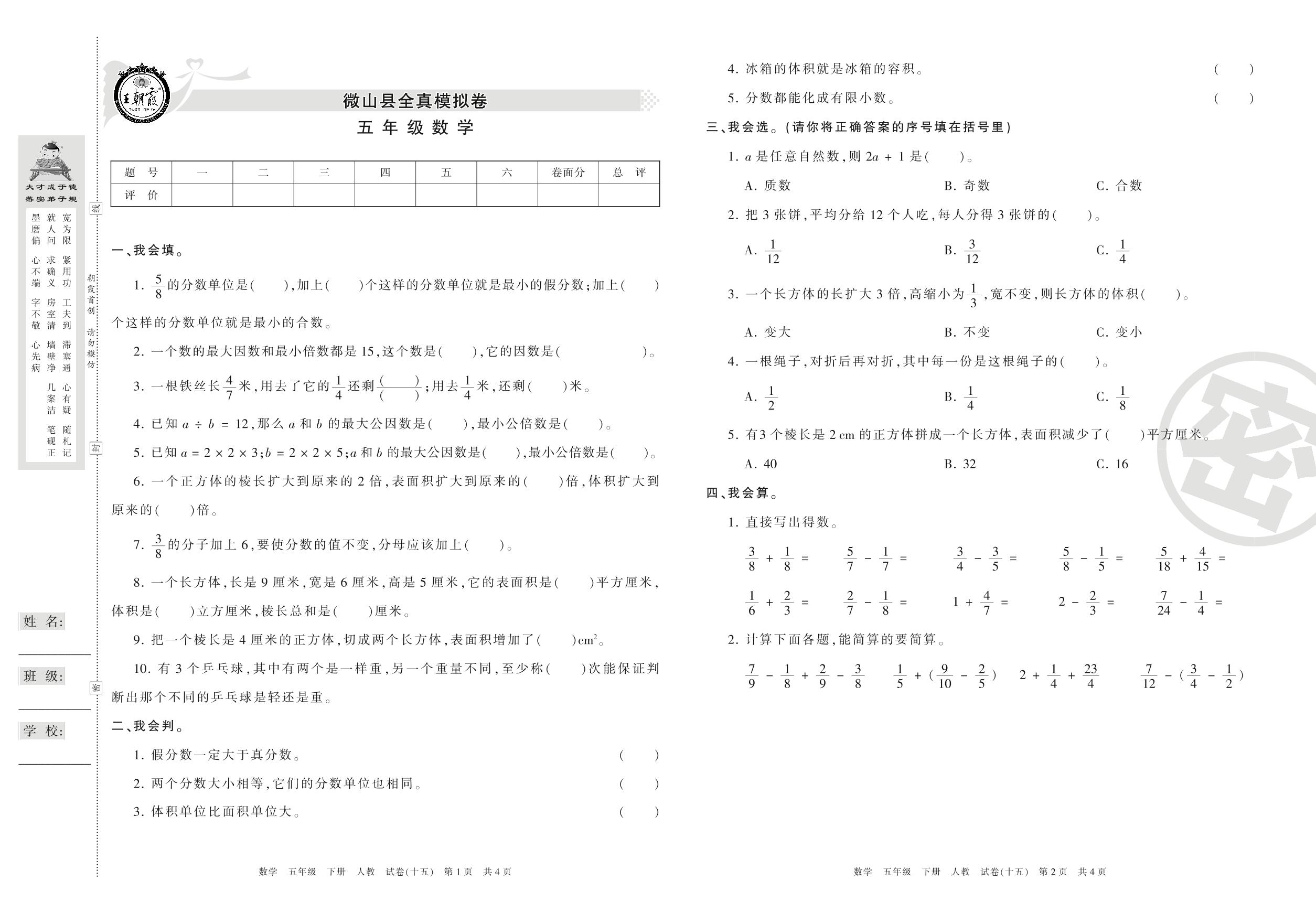 2015-2016学年第二学期济宁市微山县全真模拟卷五年级数学试卷(人教版)【15】