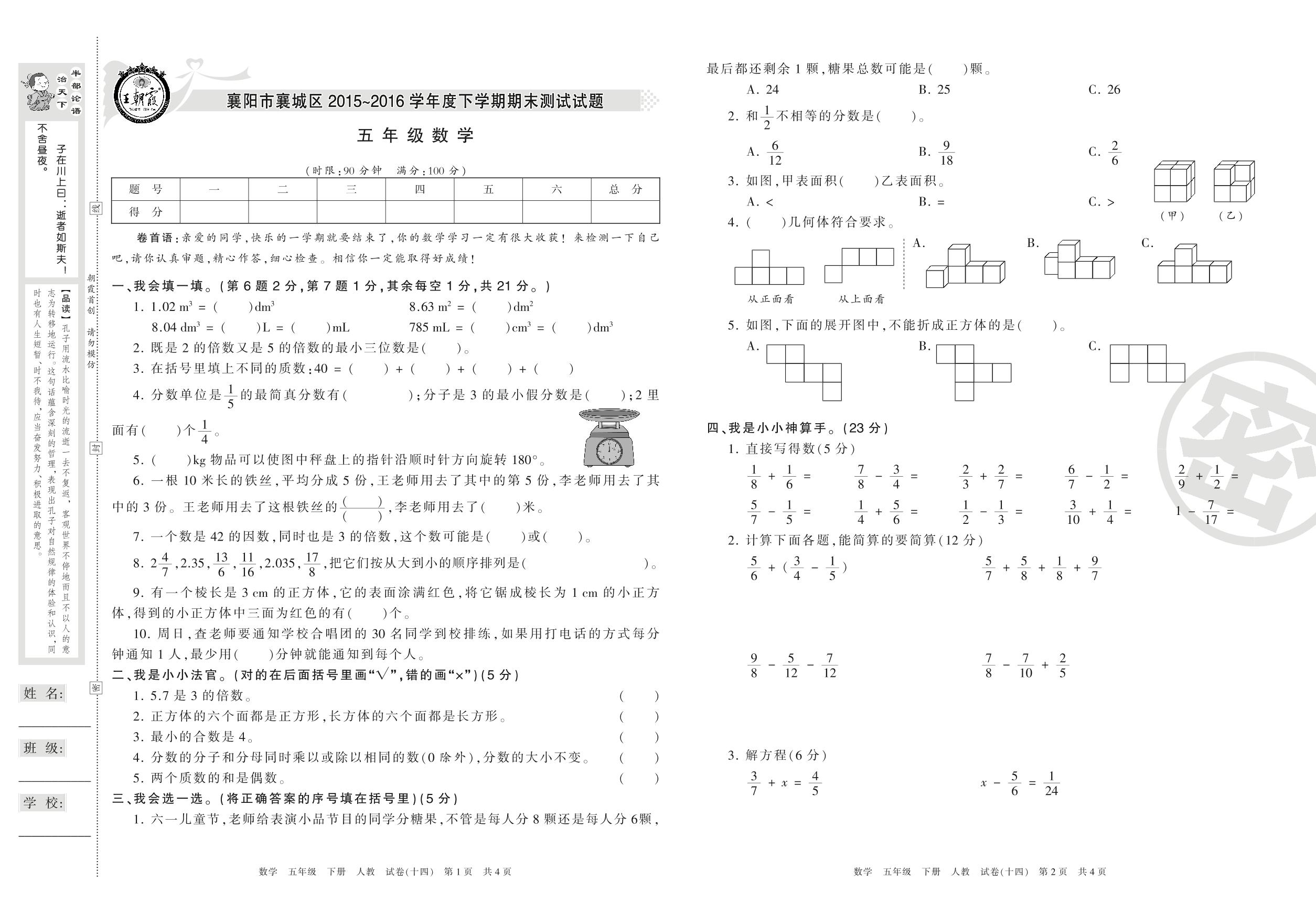 2015-2016学年第二学期襄阳市襄城区五年级数学试卷(人教版)【14】