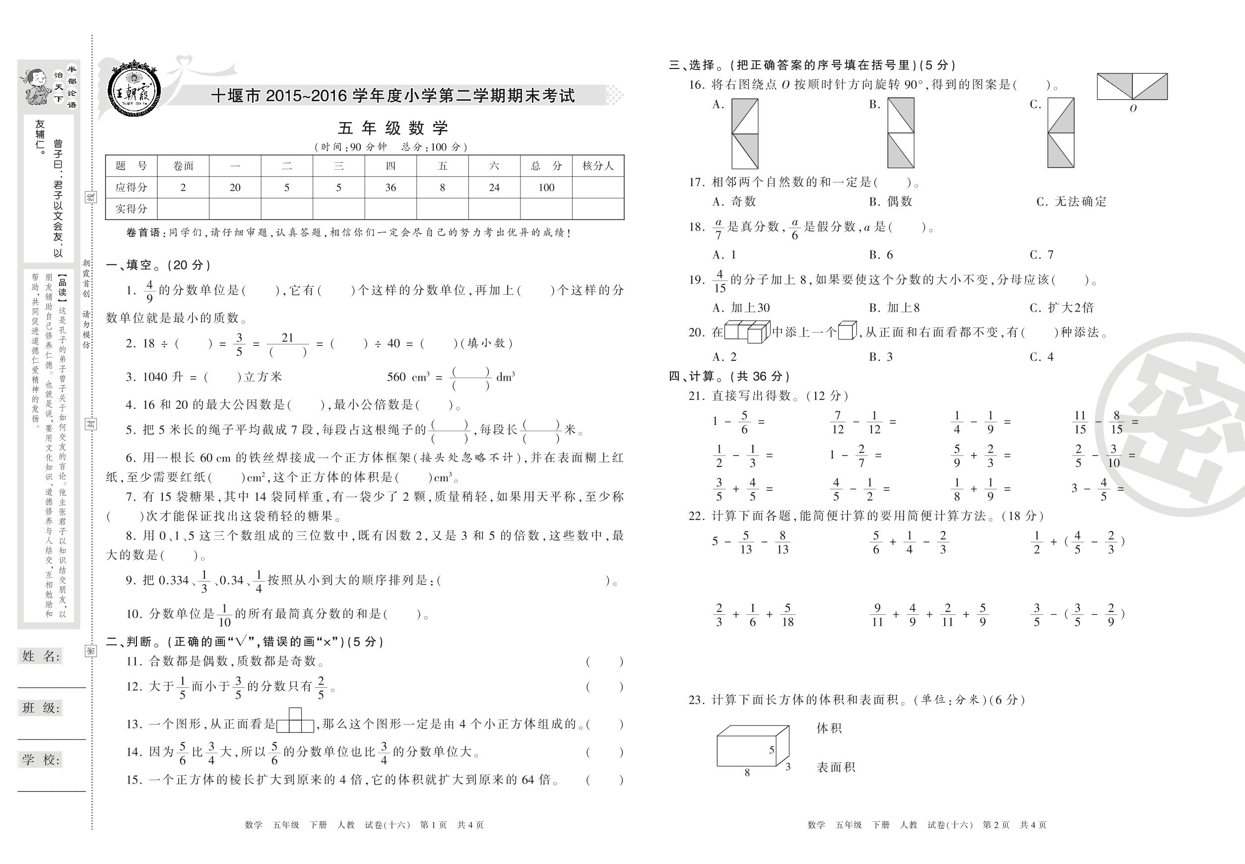 2015-2016学年第二学期十堰市五年级数学试卷(人教版)【16】